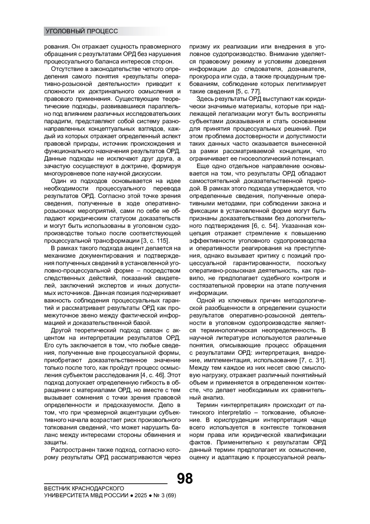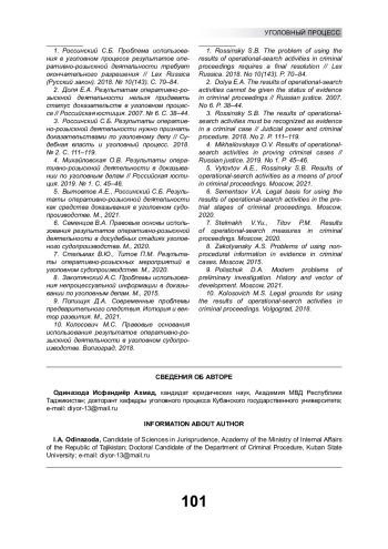 1. Россинский С.Б. Проблема использования в уголовном процессе результатов оперативно-розыскной деятельности требует окончательного разрешения // Lex Russica (Русский закон). 2018. № 10(143). С. 70-84. EDN: YLYUSL