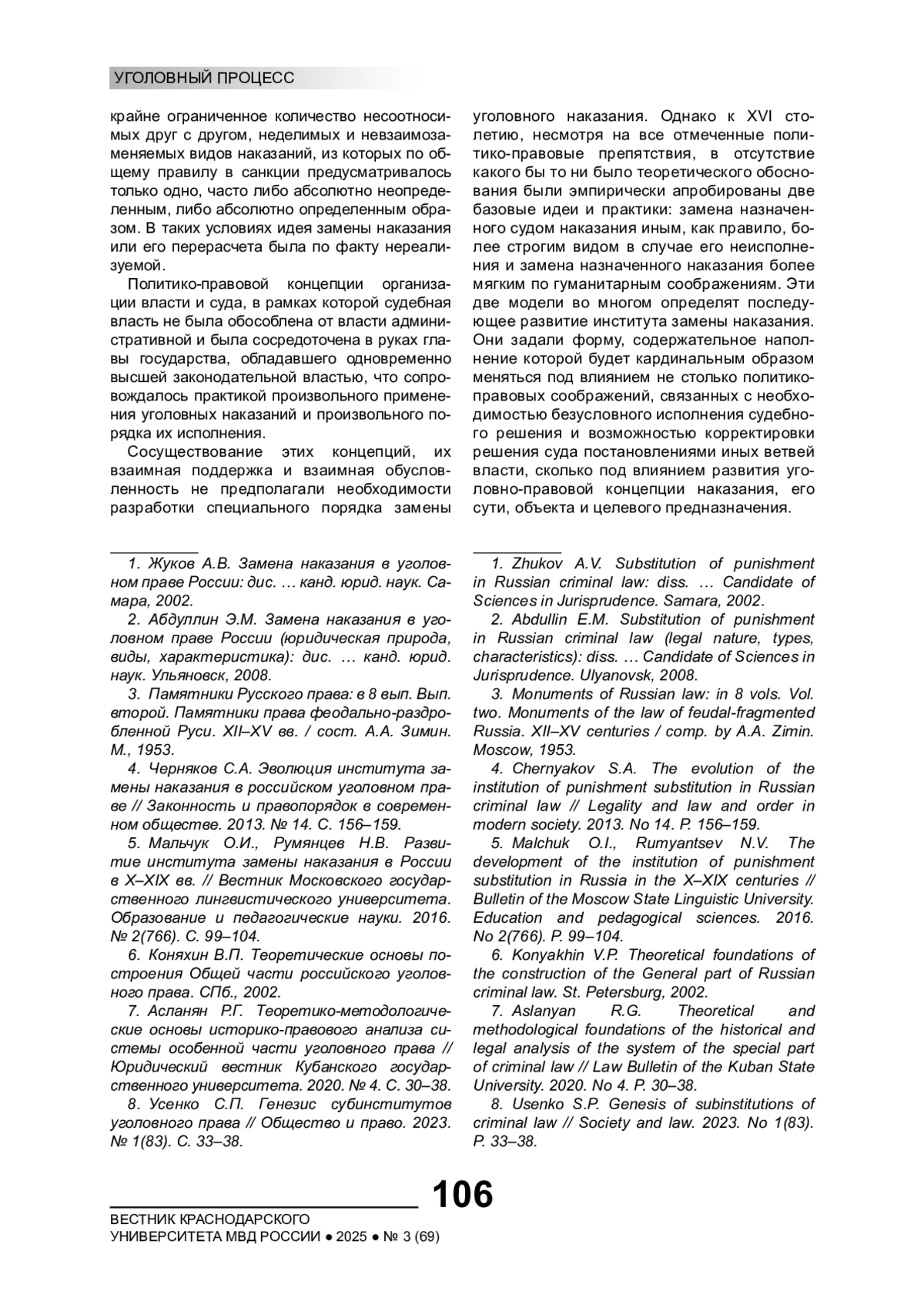 1. Жуков А.В. Замена наказания в уголовном праве России: дис. … канд. юрид. наук. Самара, 2002. EDN: NMAAIB