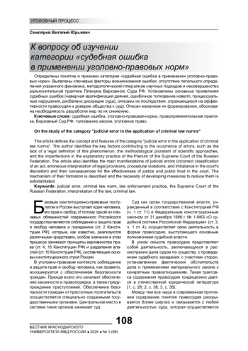 Определены понятие и признаки категории «судебная ошибка в применении уголовно-правовых норм». Выявлены ключевые факторы возникновения ошибок: отсутствие легального определения указанного феномена, методологический плюрализм научных подходов и несовершенство разъяснительной практики Пленума Верховного Суда РФ. Установлены основные проявления судебных ошибок (неверная квалификация деяния, ошибочное толкование новелл, процессуальные нарушения, дисбаланс дискреции суда), описаны их последствия, отражающиеся на эффективности правосудия и доверии общества к суду. Описан механизм их формирования, обоснована необходимость разработки мер по их снижению