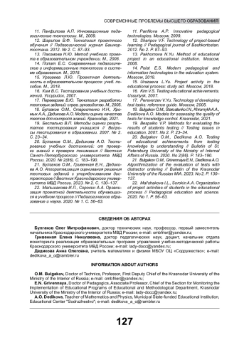 20. Булгаков О.М., Дедикова А.О. Тестирование учебных достижений: от проверки знаний к проверке понимания // Вестник Санкт-Петербургского университета МВД России. 2020. № 2(86). С. 183-190. EDN: HQILNQ