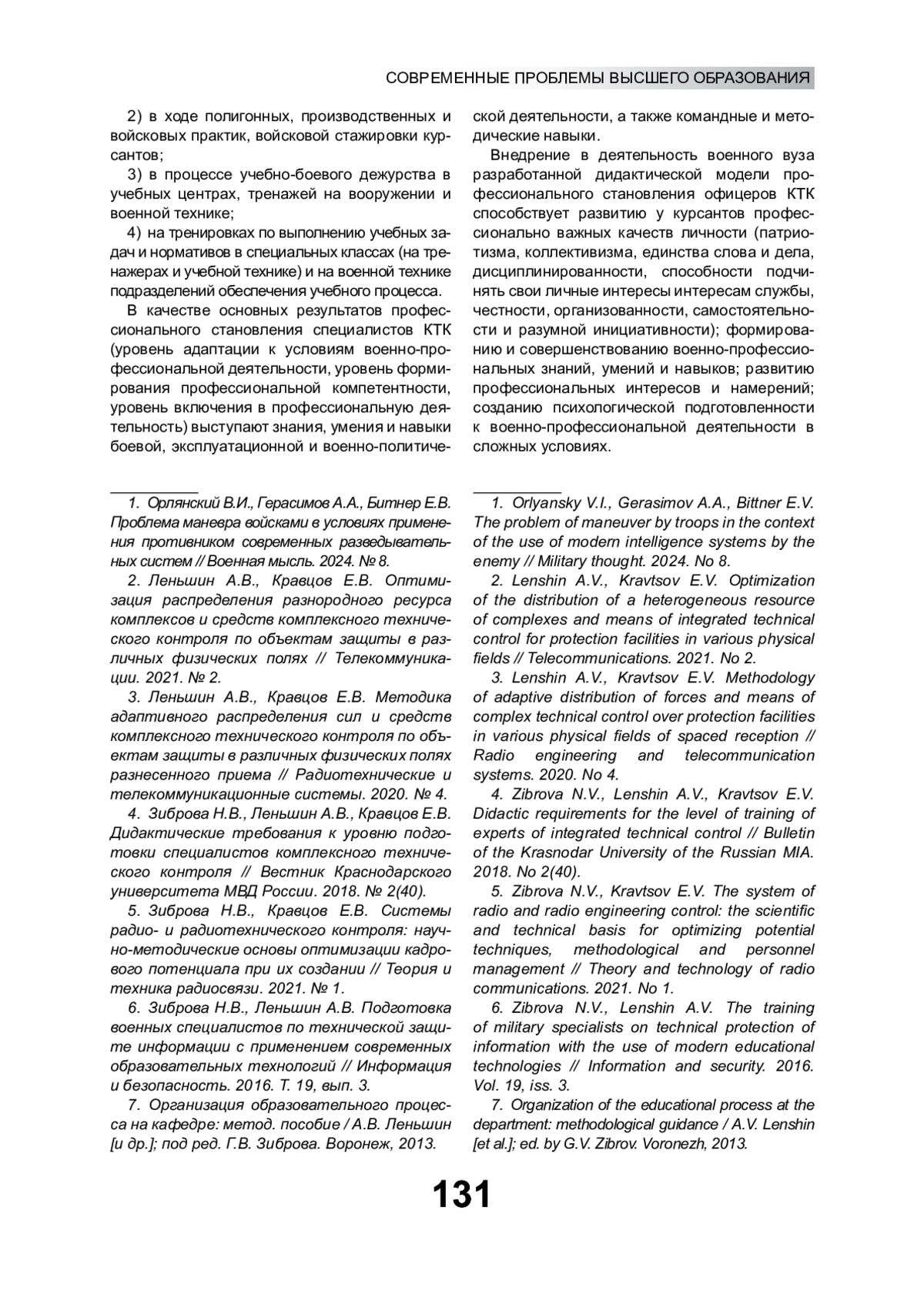 5. Зиброва Н.В., Кравцов Е.В. Системы радио- и радиотехнического контроля: научно-методические основы оптимизации кадрового потенциала при их создании // Теория и техника радиосвязи. 2021. № 1.
