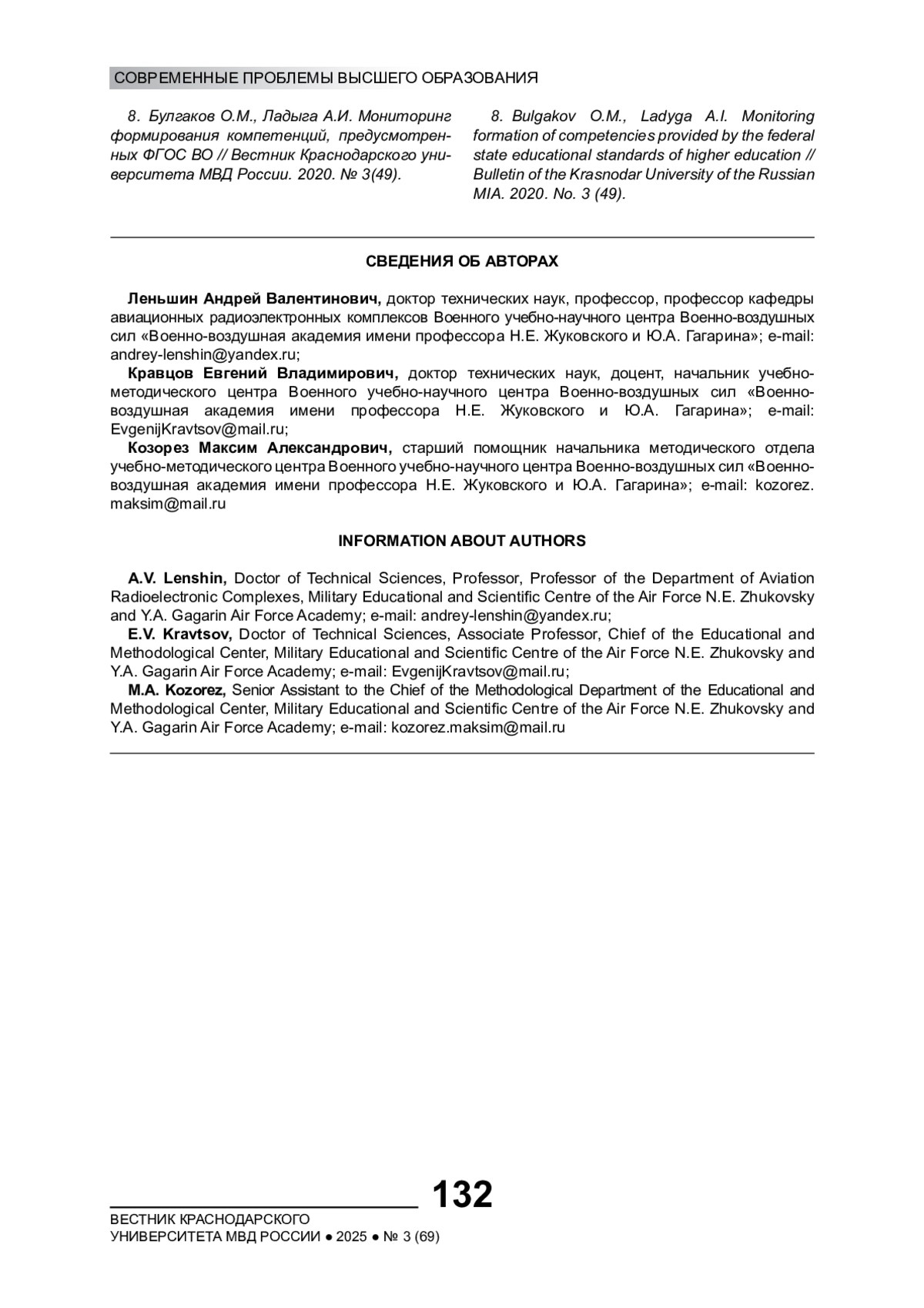 8. Булгаков О.М., Ладыга А.И. Мониторинг формирования компетенций, предусмотренных ФГОС ВО // Вестник Краснодарского университета МВД России. 2020. № 3(49). EDN: STMIFW
