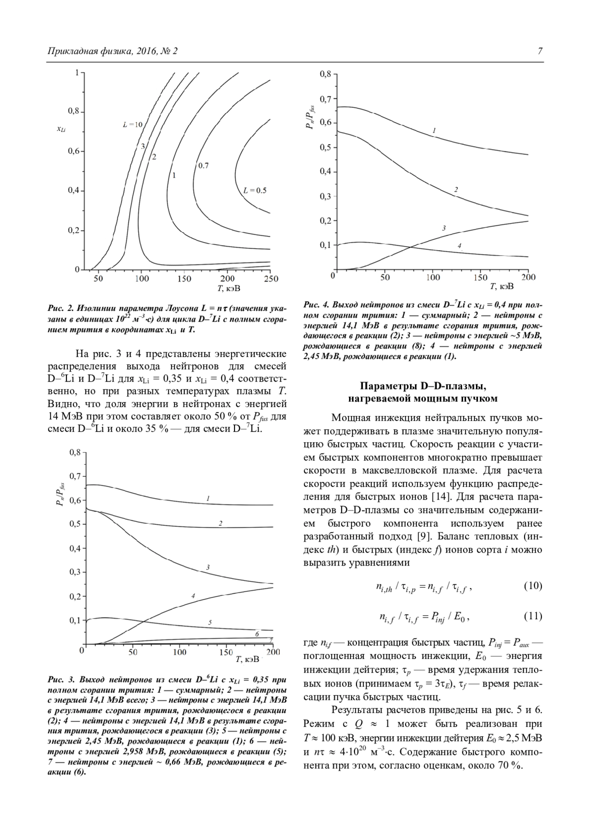 Рассматриваются возможности использования D–D-плазмы для генерации быстрых нейтронов. Важное преимущество D–D-реакции заключается в том, что отпадает необходимость воспроизводства трития. D–D-плазма может быть источником нейтронов с энергией 14 МэВ, которые рождаются в результате сгорания образующегося трития. Рассмотрено влияние примеси лития, который в небольшом количестве улучшает энергобаланс D–Dплазмы. Оптимальное с точки зрения критерия Лоусона отношение концентраций лития и дейтерия составляет 0,3—0,4. Выход в нейтронах с энергией 14 МэВ составляет около 50 % при добавлении лития-6 и около 35 % при добавлении лития-7. Требуются температуры около 100 кэВ. Поэтому для этого вида термоядерного топлива давление плазмы должно быть примерно равно магнитному давлению. Для увеличения скорости реакции может быть использован интенсивный нагрев пучком быстрых атомов. При этом коэффициент усиления в плазме Q ~ 1 может достигаться при температуре электронов около 100 кэВ и энергии инжектируемых дейтронов около 2 МэВ.