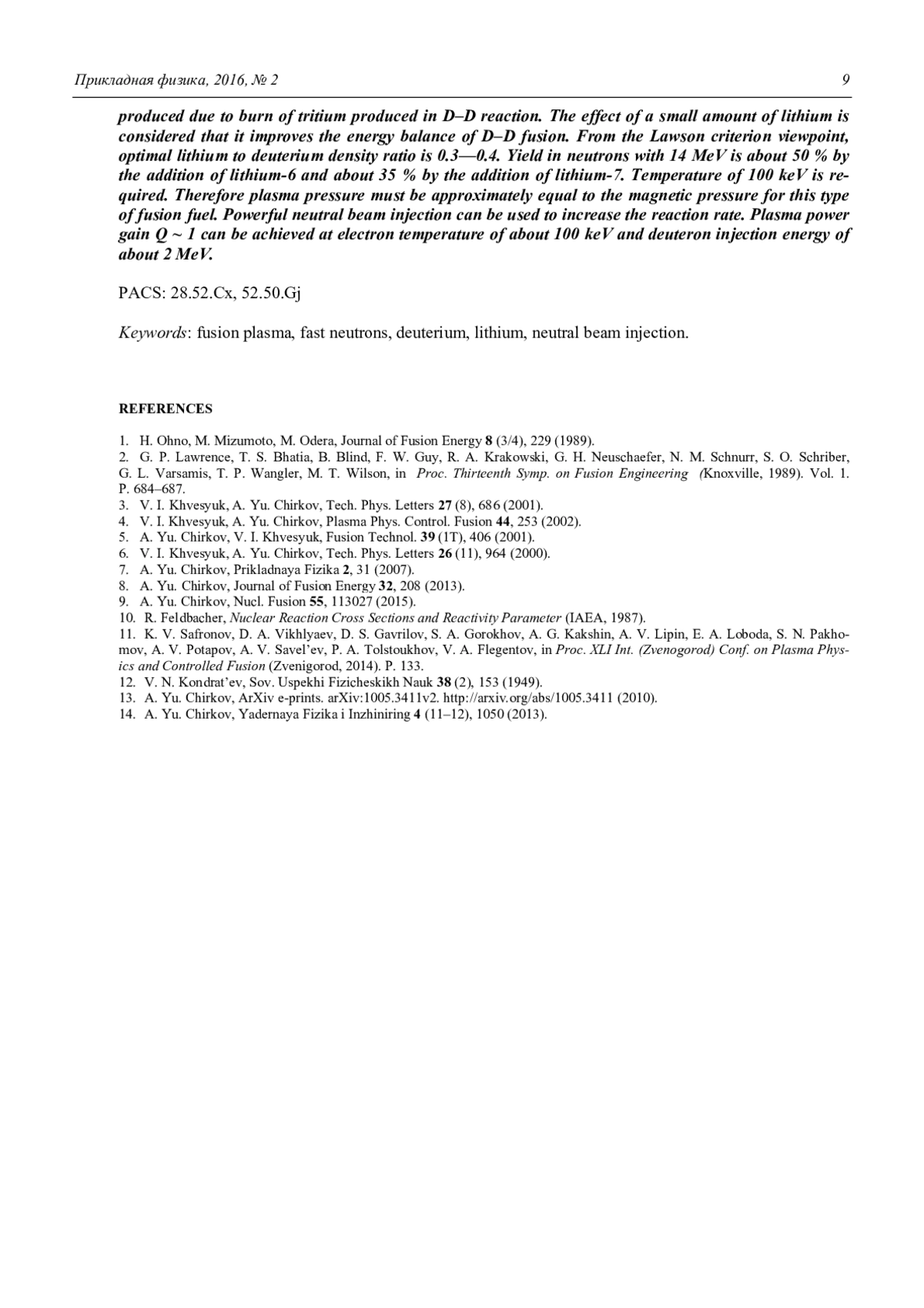 8. Chirkov A. Yu. // Journal of Fusion Energy. 2013. Vol. 32. No. 2. P. 208.