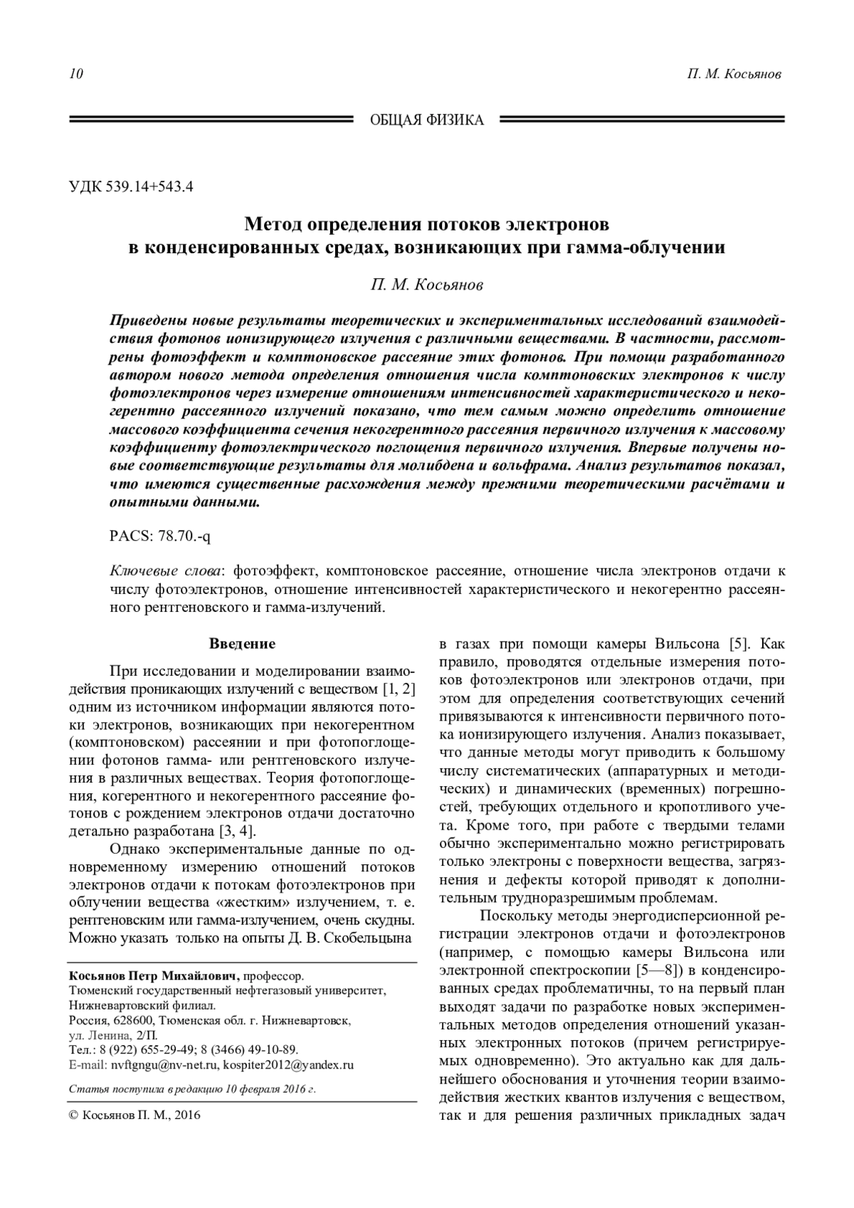Косьянов П. М. Метод определения потоков электронов в конденсированных средах, возникающих при гамма-облучении 10