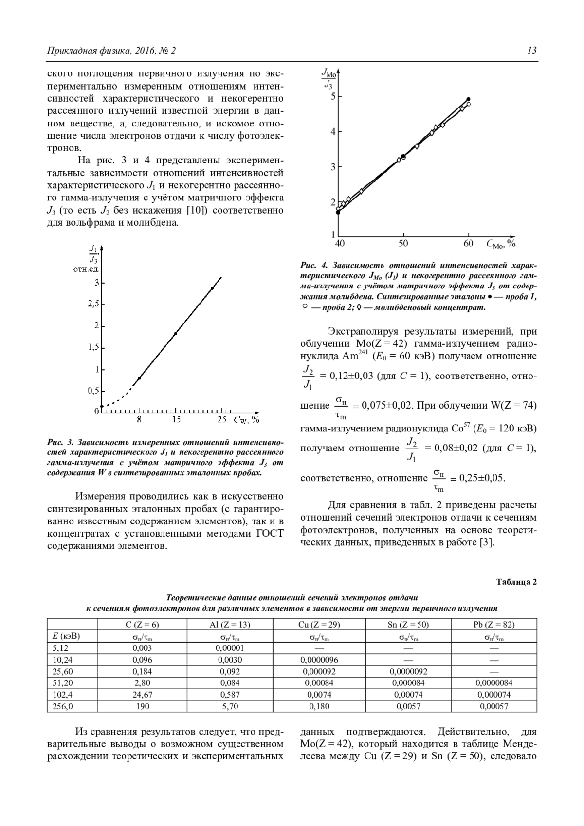 Впервые определены отношения числа электронов отдачи к числу фотоэлектронов по экспериментально измеренным отношениям интенсивностей характеристического и некогерентно рассеянного гамма-излучения с учетом матричного эффекта на атомах молибдена и вольфрама. Новые результаты измеренных одновременно отношений сечений для тяжелых атомов при помощи разработанного автором метода, а также старые измерения этих отношений для легких атомов (в воздухе) при помощи камеры Вильсона при их сравнении с теоретическими расчетами показывают, что для рентгеновского и гамма-излучений рассматриваемого диапазона энергий (10150 кэВ) наблюдается значительное (на порядок и более) однонаправленное расхождение.