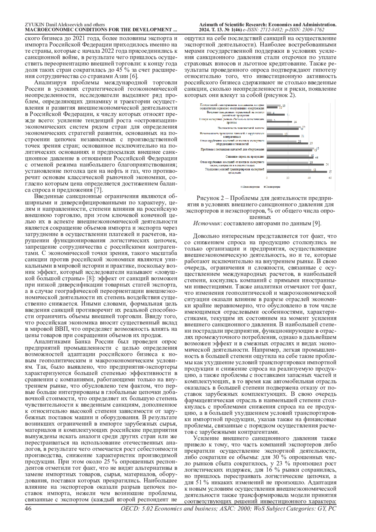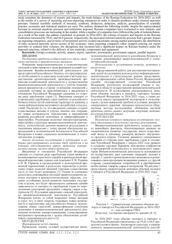 Целью настоящей работы является проведение оценки условий осуществления внешнеэкономической деятельности российским бизнесом в условиях изменившейся макроэкономической и геополитической ситуации. В исследовании рассматривается динамика объемов экспорта и импорта, торгового баланса Российской Федерации за 2016-2023 годы, а также результаты опроса предприятий экспортеров и неэкспортеров с целью выявления проблем в условиях внешнего санкционного давления. Используются общенаучные методы проведения исследования, синтез, дедукция, индукция, анализ, обобщение научной практики, экономико-статистический анализ. Авторами получены следующие результаты: несмотря на беспрецедентное усиление внешнего санкционного давления и введенные ограничения, российские компании переориентировались на новые рынки, а на рынке отмечается усиление процессов консолидации, ряд компаний же пошли по пути редомициляции. В результате исследования авторами были сделаны выводы: в целом за 2016-2023 годы объемы экспорта и импорта в Российской Федерации увеличились на 59,41 и 66,9 процентов соответственно; усиление внешнего санкционного давления в большей степени повлияло на деятельность предприятий-экспортеров, а в аспекте осуществления инвестиционной деятельности создало неопределенность среди участников рынка; распределение рисков произошло неравномерно по отраслям экономики; часть компаний экспортеров либо прекратили осуществление экспортной деятельности, либо сократили ее объемы; существенное влияние на российский бизнес в условиях введенных санкций оказали возникшие перебои, связанные с доставкой сырья, комплектующих и оборудования.