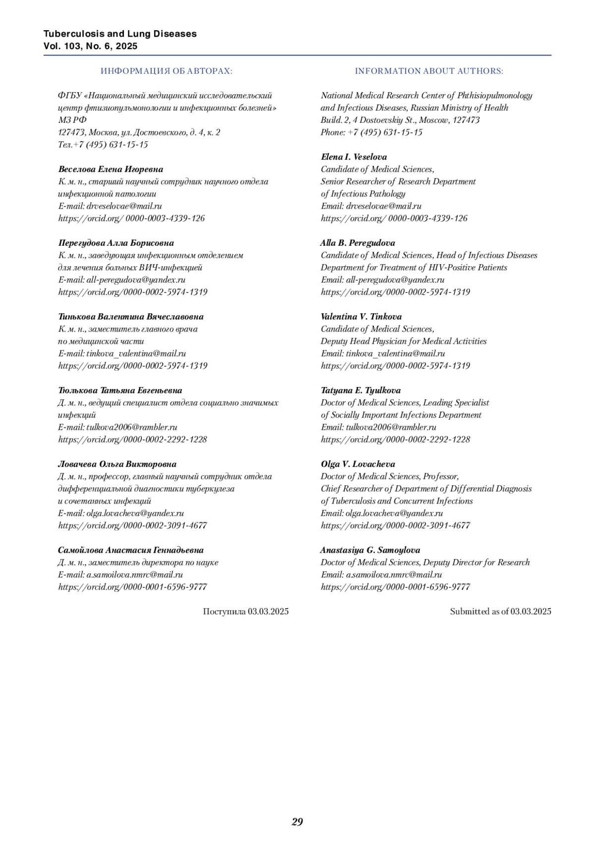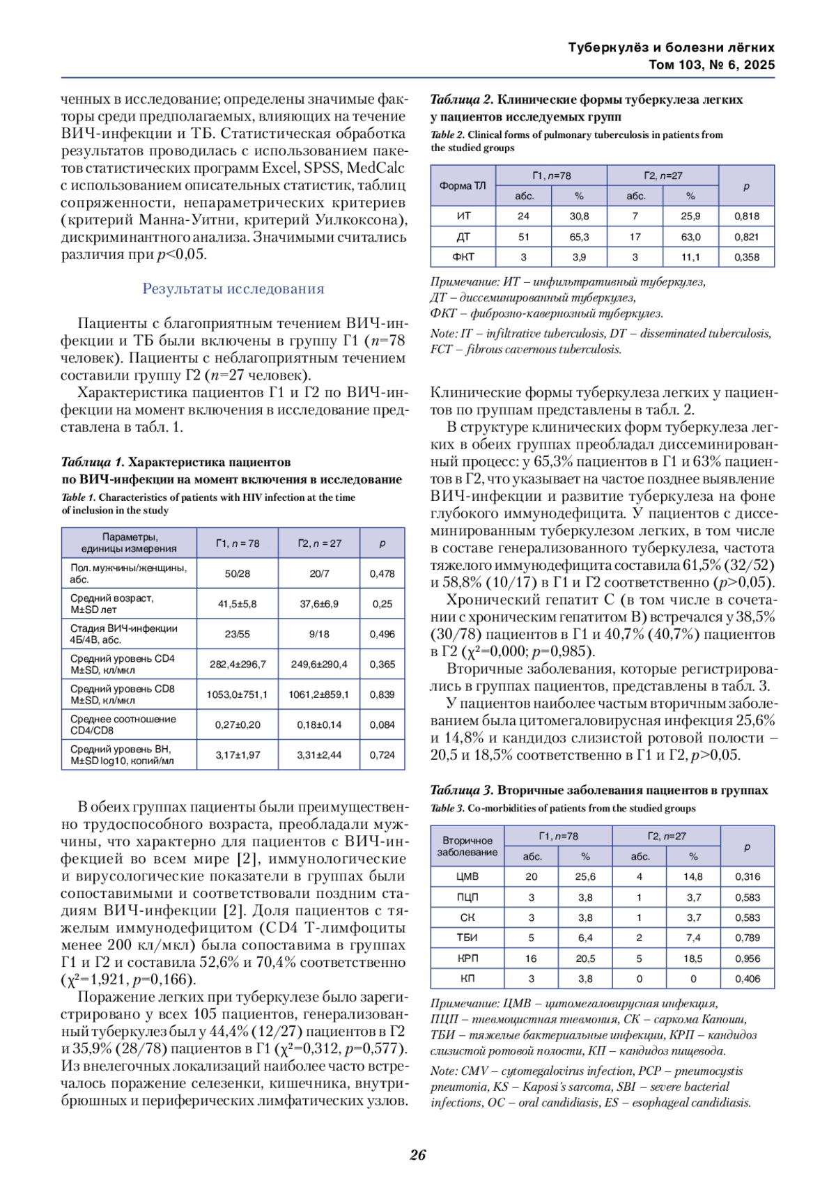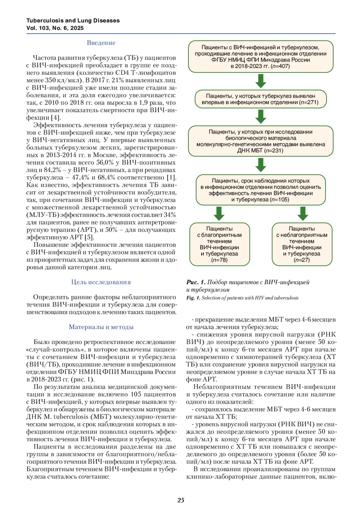 Цель исследования: определить ранние факторы неблагоприятного течения сочетания ВИЧ-инфекции и туберкулеза для совершенствования подходов к лечению таких пациентов.