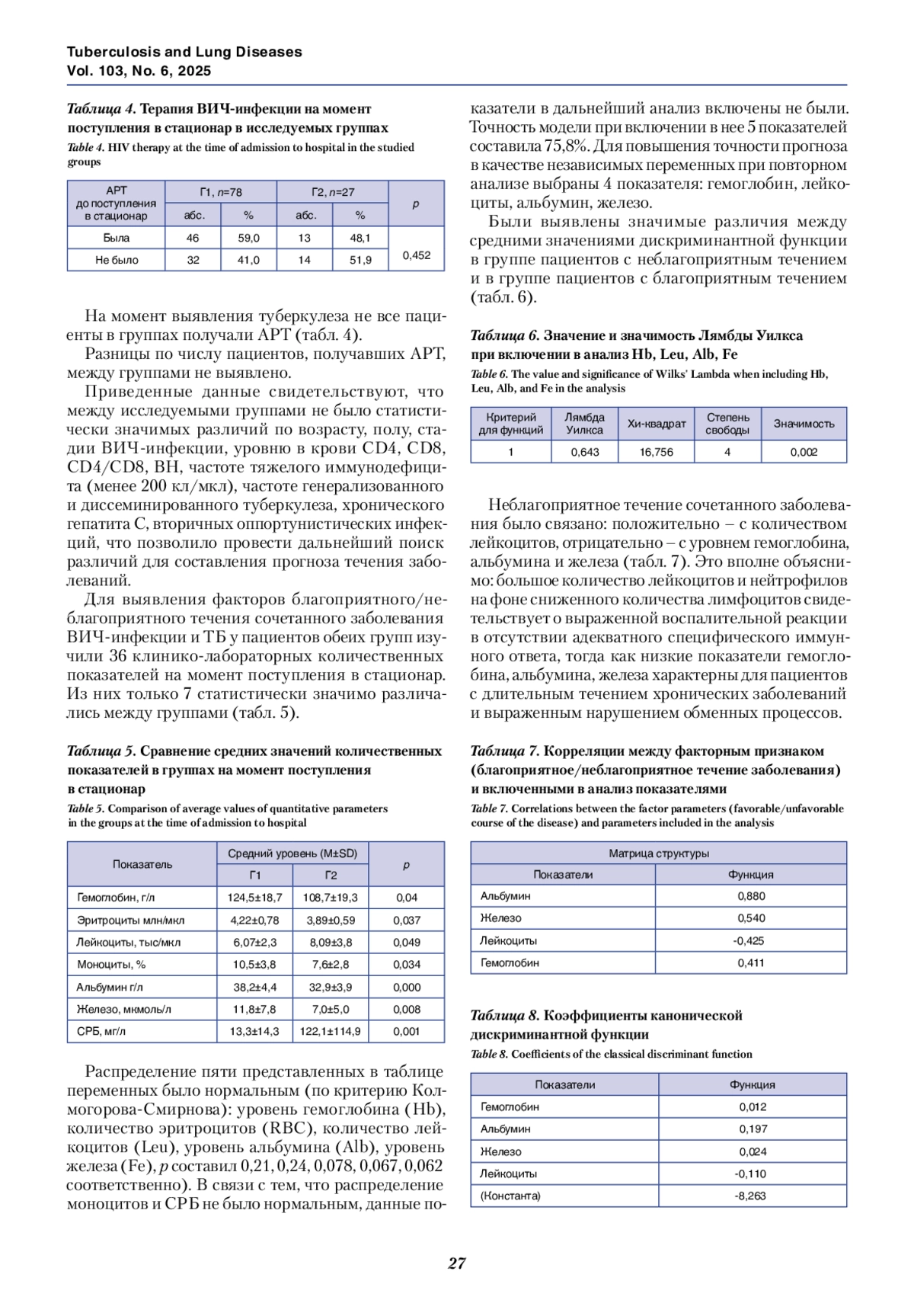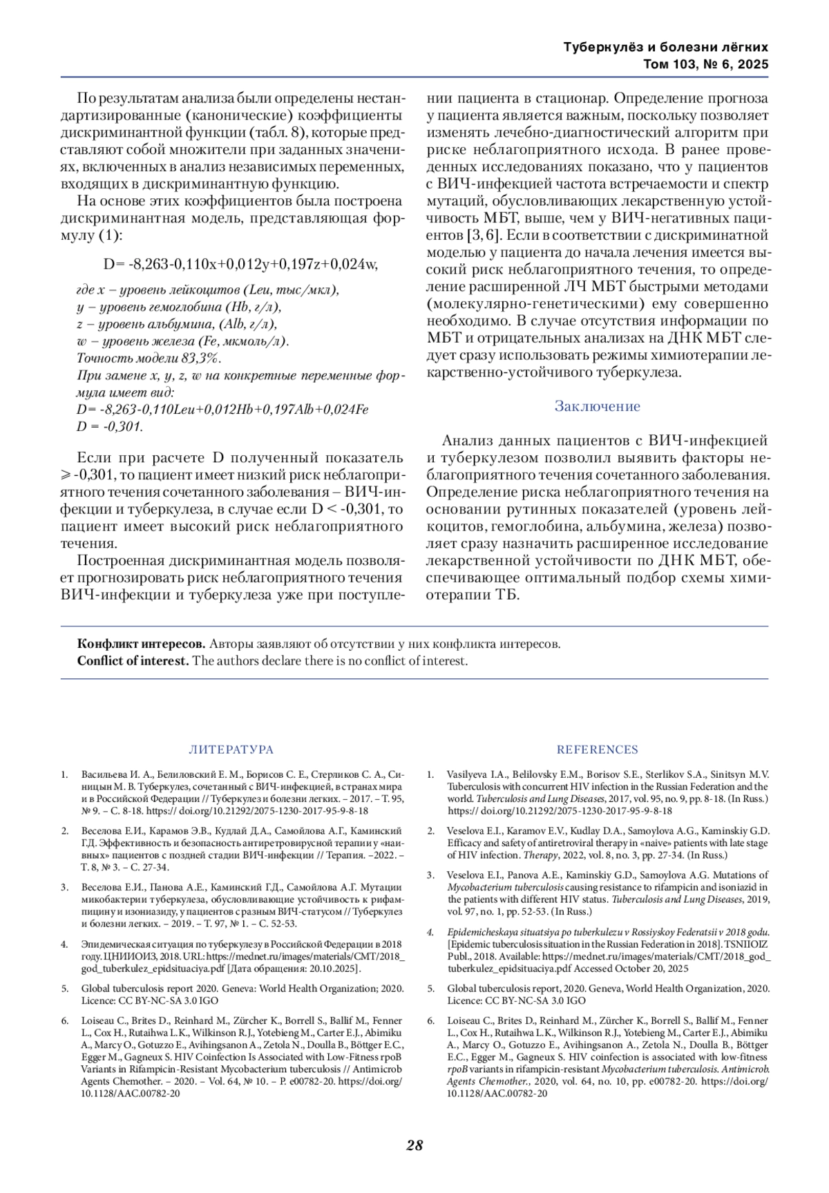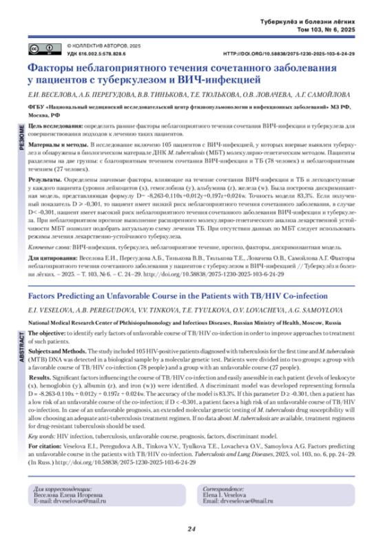 Результаты. Определены значимые факторы, влияющие на течение сочетания ВИЧ-инфекции и ТБ и легкодоступные у каждого пациента (уровни лейкоцитов (х), гемоглобина (у), альбумина (z), железа (w). Была построена дискриминантная модель, представляющая формулу D= -8,263-0,110x+0,012y+0,197z+0,024w. Точность модели 83,3%. Если полученный показатель D ≥ -0,301, то пациент имеет низкий риск неблагоприятного течения сочетанного заболевания, в случае D< -0,301, пациент имеет высокий риск неблагоприятного течения сочетанного заболевания ВИЧ-инфекции и туберкулеза. При неблагоприятном прогнозе выполнение расширенного молекулярно-генетического анализа лекарственной устойчивости МБТ позволит подобрать актуальную схему лечения ТБ. При отсутствии данных по МБТ следует использовать режимы лечения лекарственно-устойчивого туберкулеза.