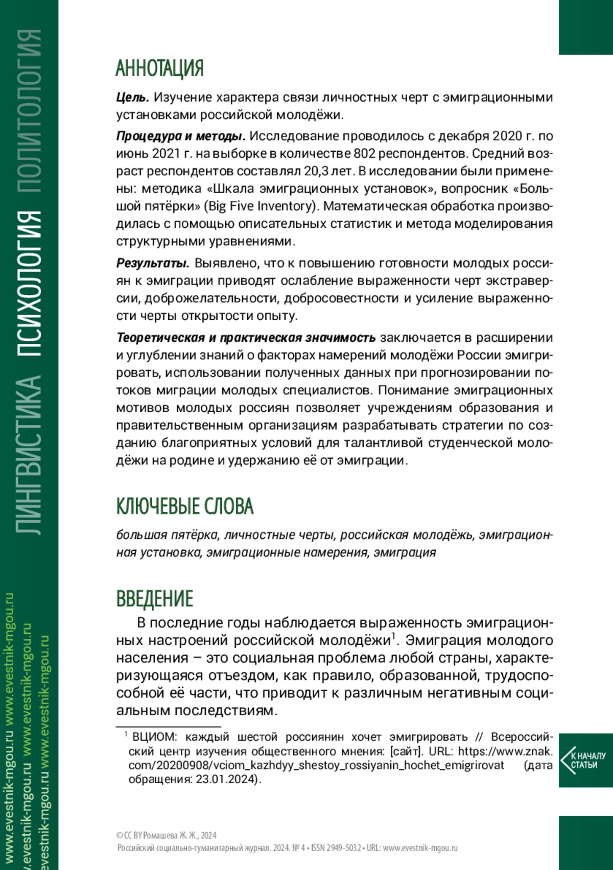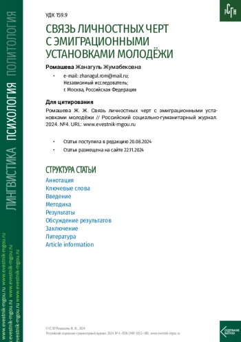 Результаты. Выявлено, что к повышению готовности молодых россиян к эмиграции приводят ослабление выраженности черт экстраверсии, доброжелательности, добросовестности и усиление выраженности черты открытости опыту.