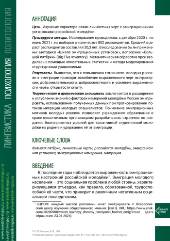 Цель. Изучение характера связи личностных черт с эмиграционными установками российской молодёжи.