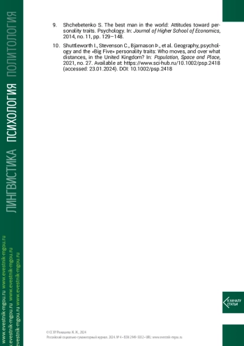 10. Shuttleworth I., Stevenson C., Bjarnason Þ., et al. Geography, psychology and the «Big Five» personality traits: Who moves, and over what distances, in the United Kingdom? [Электронный ресурс] // Popul space place. 2021. №27. URL: https://www.sci-hub.ru/10.1002/psp.2418 (дата обращения: 23.01.2024). https://doi.org/10.1002/psp.2418
