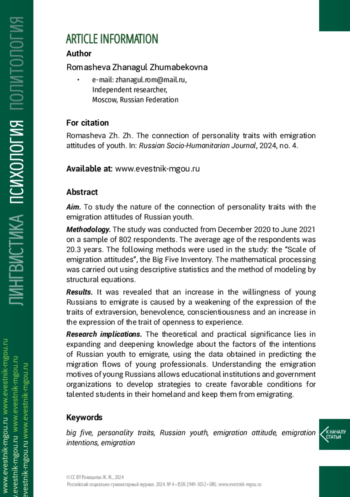 Процедура и методы. Исследование проводилось с декабря 2020 г. по июнь 2021 г. на выборке в количестве 802 респондентов. Средний возраст респондентов составлял 20,3 лет. В исследовании были применены: методика «Шкала эмиграционных установок», вопросник «Большой пятёрки» (Big Five Inventory). Математическая обработка производилась с помощью описательных статистик и метода моделирования структурными уравнениями.