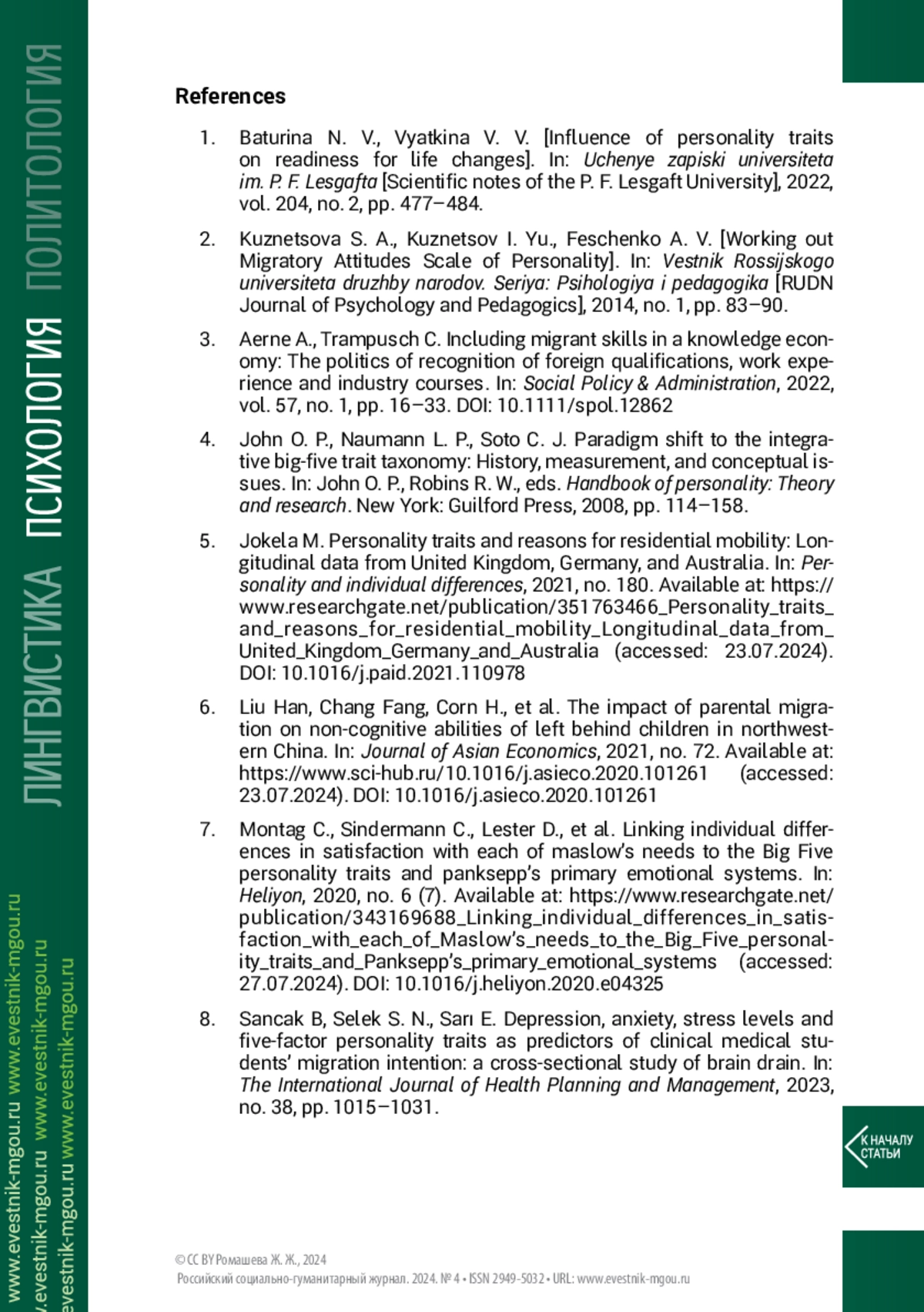 8. Sancak B., Selek S. N., Sarı E. Depression, anxiety, stress levels and five-factor personality traits as predictors of clinical medical students’ migration intention: a cross-sectional study of brain drain // The International Journal of Health Planning and Management. 2023. №38. Р. 1015-1031.
