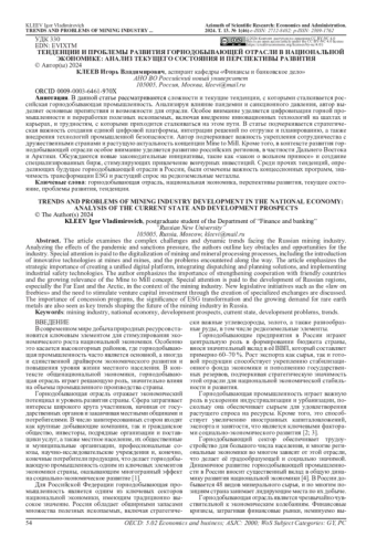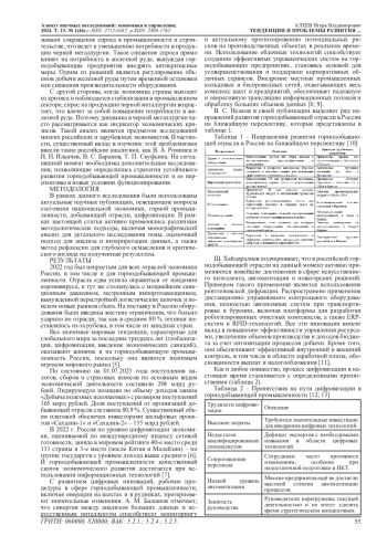В данной статье рассматриваются сложности и текущие тенденции, с которыми сталкивается российская горнодобывающая промышленность. Анализируя влияние пандемии и санкционного давления, автор выделяет основные препятствия и возможности для отрасли. Особое внимание уделяется цифровизации горной промышленности и переработки полезных ископаемых, включая внедрение инновационных технологий на шахтах и карьерах, и трудностям, с которыми приходится сталкиваться на этом пути. В статье подчеркивается стратегическая важность создания единой цифровой платформы, интеграции решений по отгрузке и планированию, а также внедрения технологий промышленной безопасности. Автор подчеркивает важность укрепления сотрудничества с дружественными странами и растущую актуальность концепции Mine to Mill. Кроме того, в контексте развития горнодобывающей отрасли особое внимание уделяется развитию российских регионов, в частности Дальнего Востока и Арктики. Обсуждаются новые законодательные инициативы, такие как «закон о вольном приносе» и создание специализированных бирж, стимулирующих привлечение венчурных инвестиций. Среди прочих тенденций, определяющих будущее горнодобывающей отрасли в России, были отмечены важность концессионных программ, значимость трансформации ESG и растущий спрос на редкоземельные металлы.