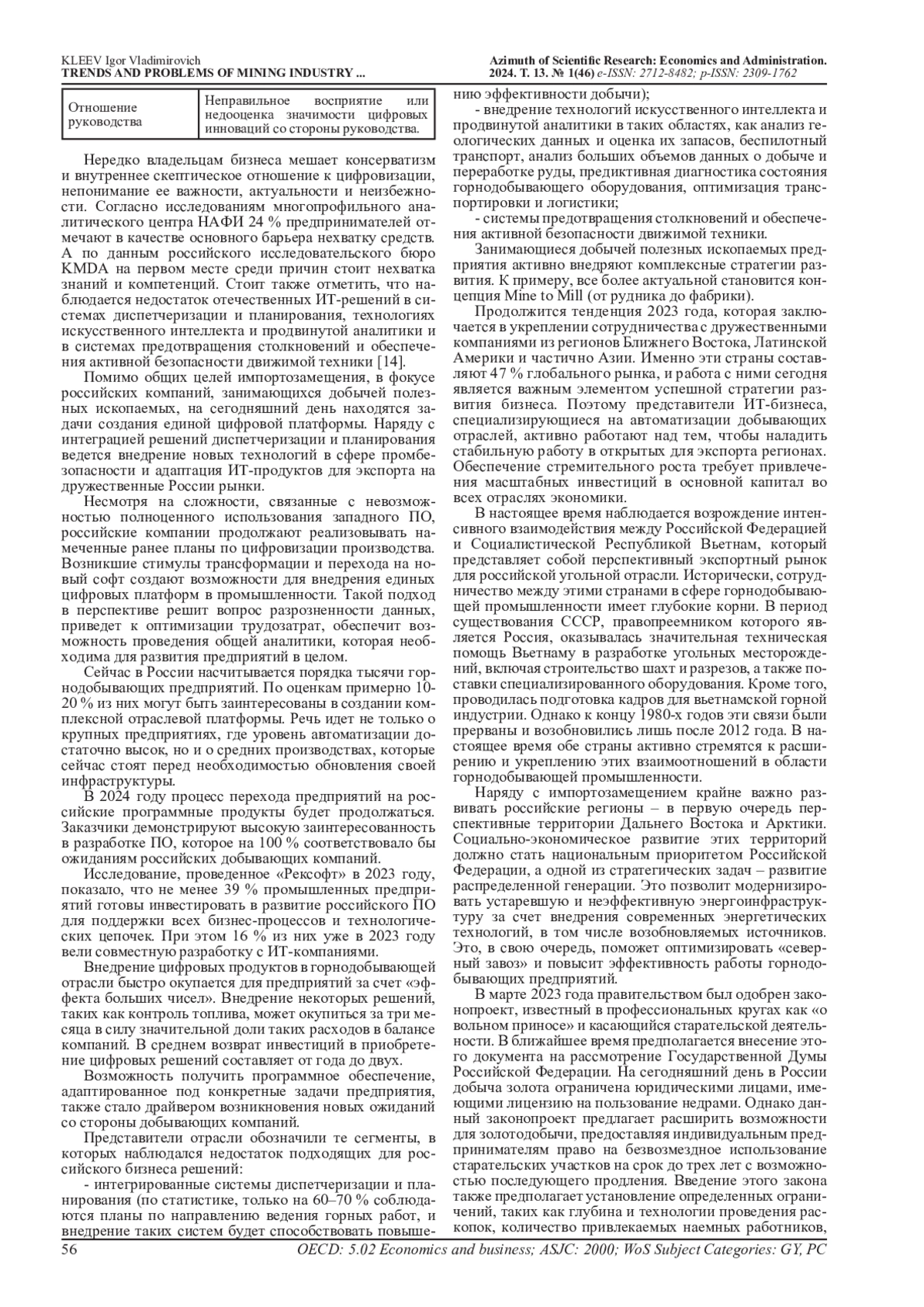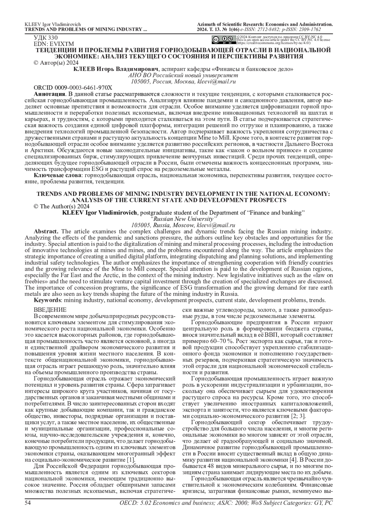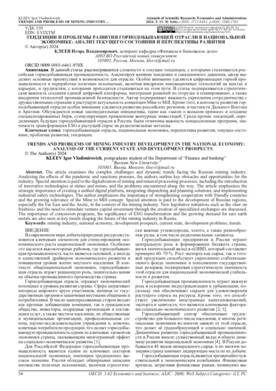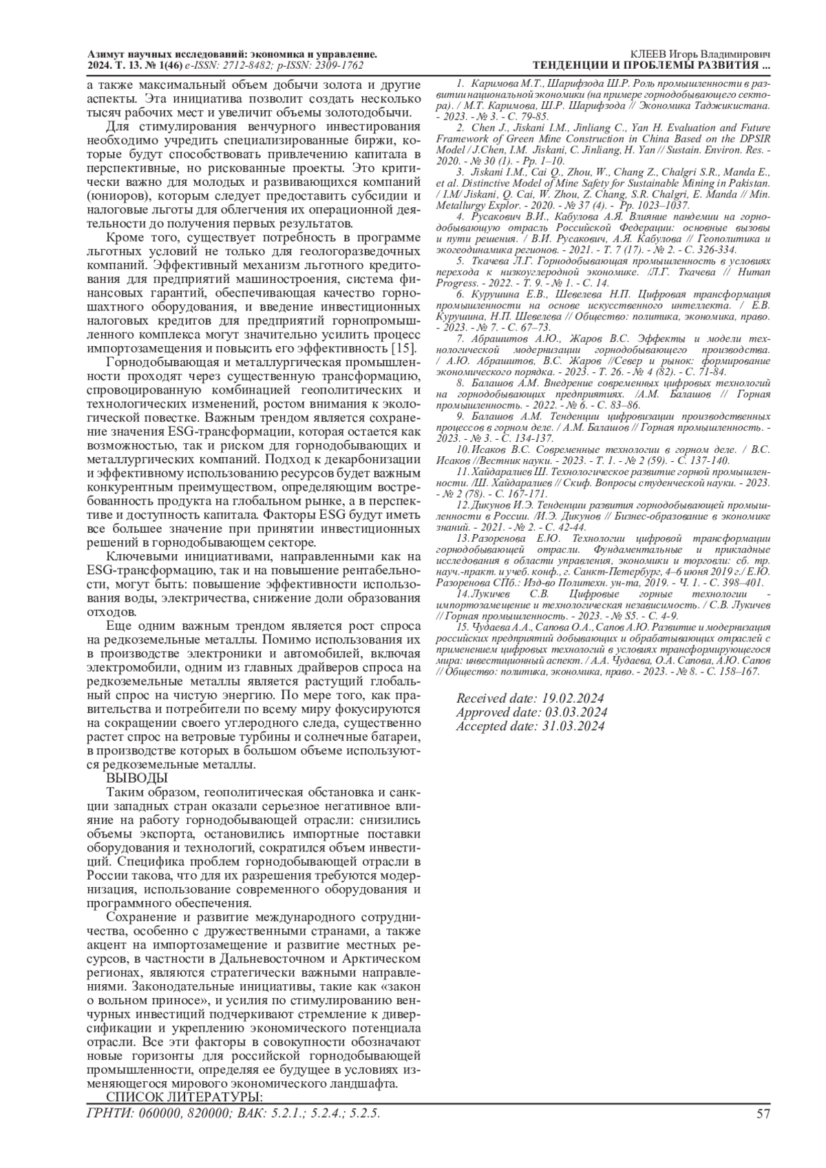 12. Дикунов И.Э. Тенденции развития горнодобывающей промышленности в России. /И.Э. Дикунов // Бизнес-образование в экономике знаний. - 2021. - № 2. - С. 42-44. EDN: YYZWYH