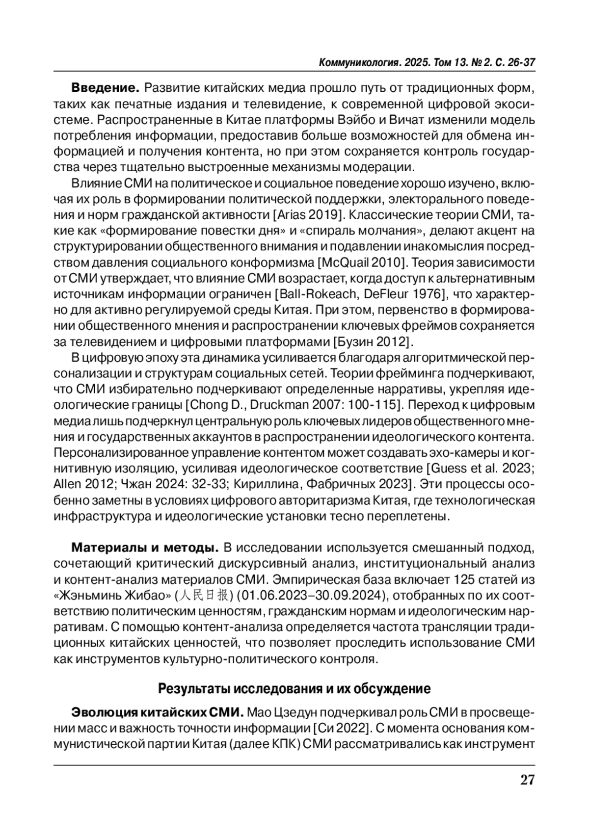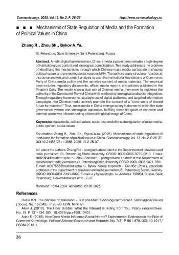 В условиях цифровой трансформации китайская медиасистема демонстрирует высокую степень институционального контроля и идеологической консолидации. Проблема исследования заключается в выявлении механизмов, посредством которых средства массовой информации в Китае участвуют в формировании политических ценностей и продвижении социальной ответственности. Научная новизна исследования заключается в синтезе эмпирических характеристик дискурса и институциональных функций через призму как классических, так и цифровых теорий медиа. В работе применяются институциональный, дискурсивный анализ и контент-анализ, позволяющие интерпретировать как институциональные основы медийной политики коммунистической партии Китая, так и содержательные характеристики медиа-нарративов. Исследование опирается на нормативные документы, публичные отчёты медиаорганизаций и статьи, опубликованные в «Жэньминь Жибао». Результаты показывают, что китайские СМИ выполняют двойную функцию: они способствуют легитимации власти коммунистической партии Китая, а также усиливают идеологическую и социальную интеграцию общества. Посредством институциональных механизмов регулирования, активного использования цифровых платформ, а также стратегических информационных кампаний китайские медиа продвигают концепцию «сообщества единой судьбы человечества». Таким образом, средства массовой информации становятся важным инструментом в системе государственного управления и идеологического влияния, выполняя как внутренние задачи консолидации, так и внешние цели формирования глобального имиджа Китая.