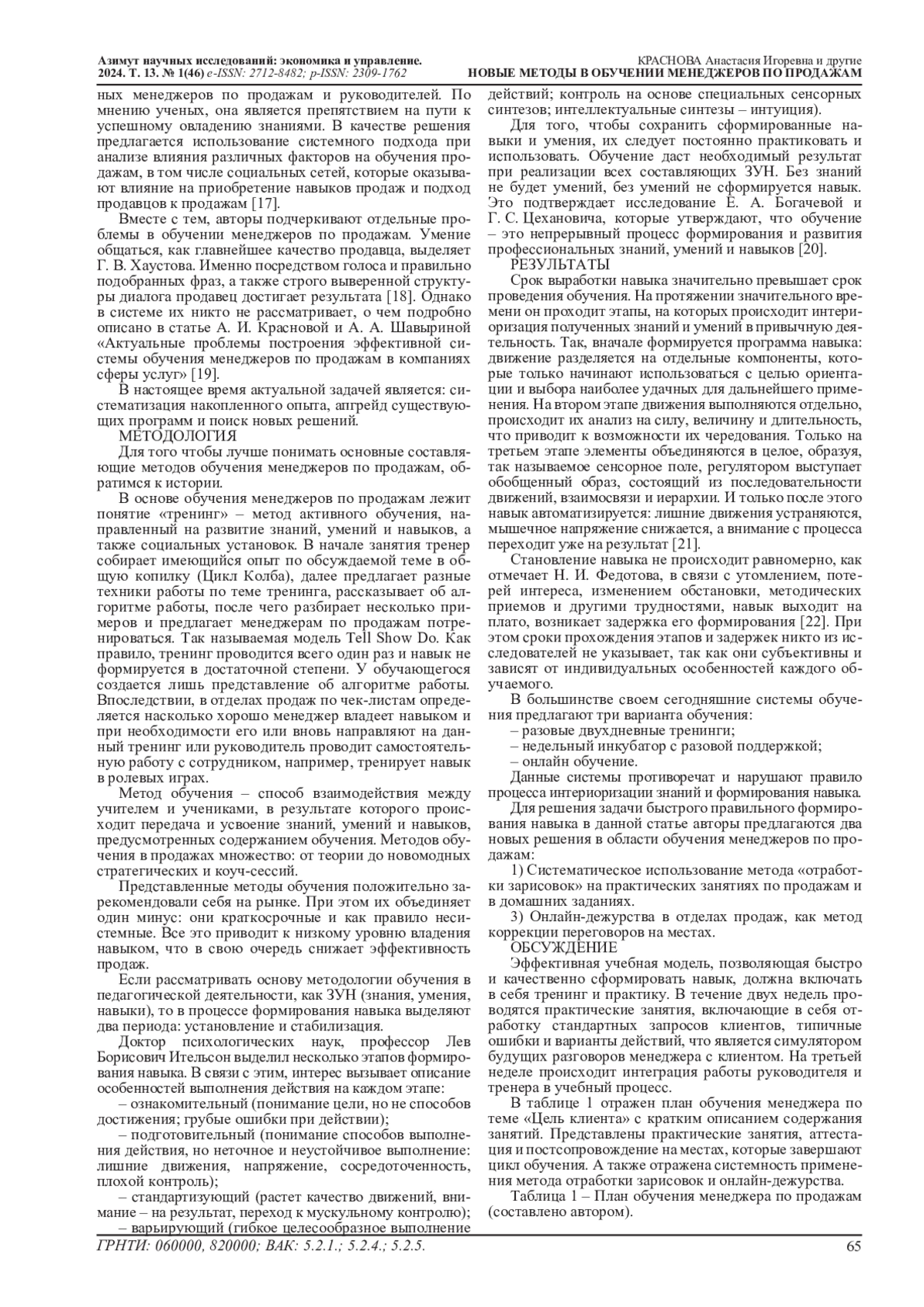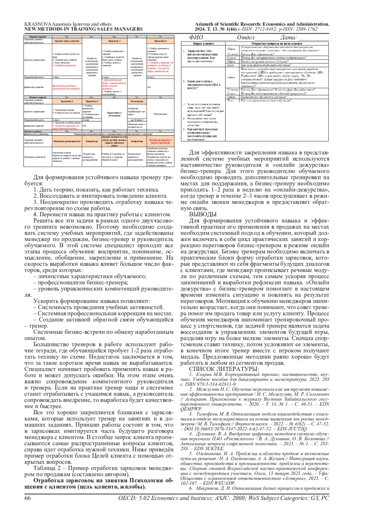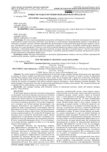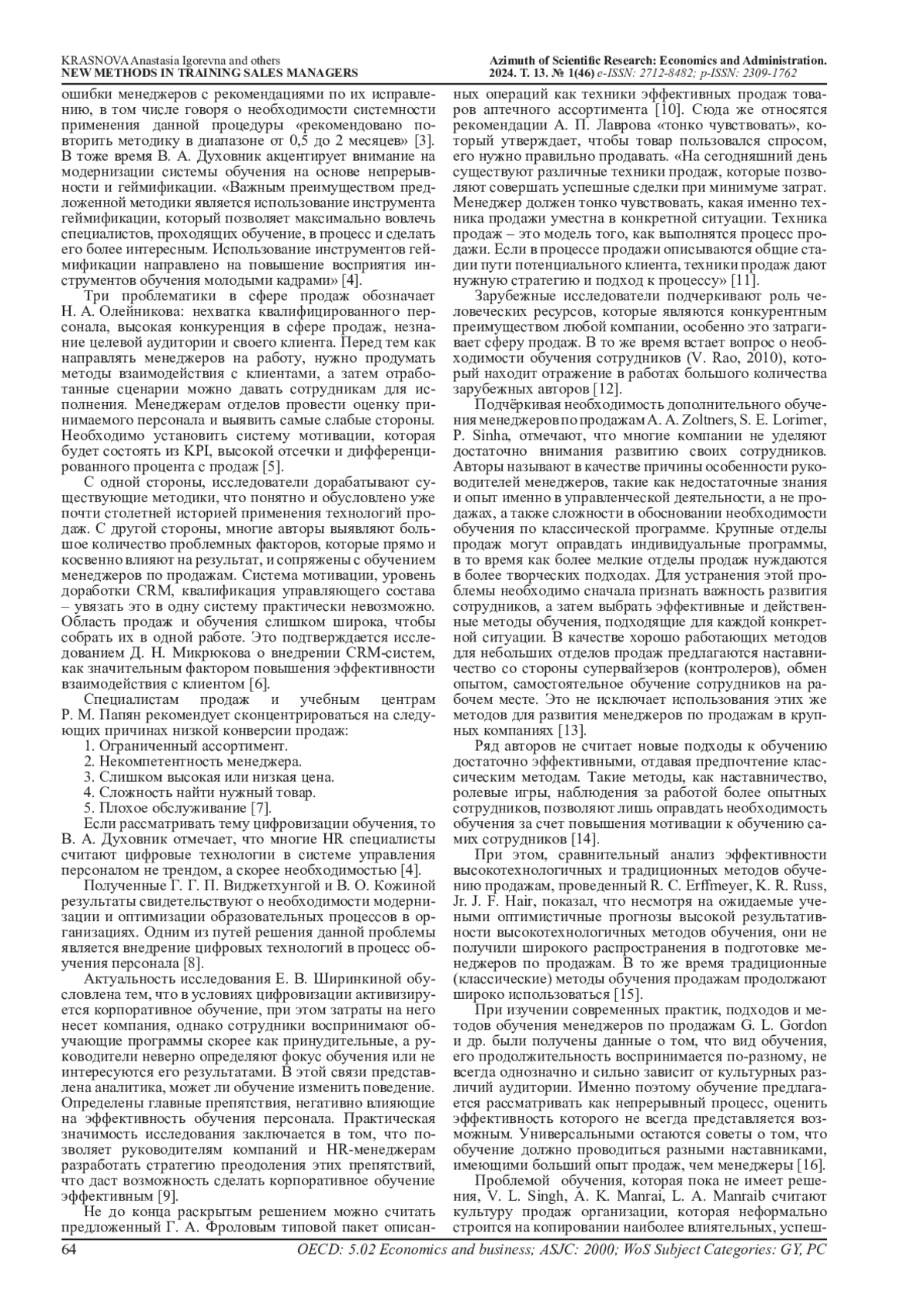 19. Краснова, А. И. Актуальные проблемы построения эффективной системы обучения менеджеров по продажам в компаниях сферы услуг / А. И. Краснова, А. А. Шавырина // Азимут научных исследований: экономика и управление. - 2023. - Т. 12, № 1(42). - С. 57-62. DOI: 10.57145/27128482_2023_12_01_11 EDN: OHCQMH