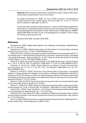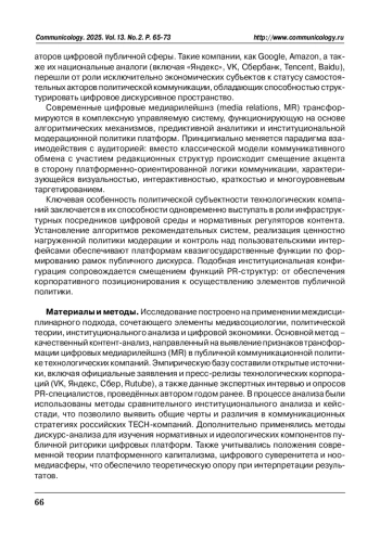 В статье рассматривается трансформация цифровых медиарилейшнз (MR) в условиях усиления политической субъектности технологических компаний (TECH-компаний). Автор исходит из предпосылки о том, что на рубеже 2010-х годов такие корпорации, как Google, Amazon, а также их российские аналоги (например Яндекс, VK, Сбербанк) стали ключевыми медиаполитическими акторами, обладающими нормативными, идеологическими и инфраструктурными функциями в цифровом пространстве. В рукописи рассмотрена институциональная роль цифровых платформ как инфраструктурных и идеологических посредников, определяющих рамки публичной дискуссии. Установлено, что информационная деятельность и медиарилейшнз этих компаний приобретают черты политической коммуникации. Эмпирические данные подтверждают смещение от традиционных моделей взаимодействия с потребителем продуктов к политической коммуникации с широкой общественностью. Делается вывод о становлении TECH-компаний как новых политических акторов и выявляет институциональную эволюцию их PR-деятельности в направлении публичной дипломатии, цифрового суверенитета и идеологического позиционирования.