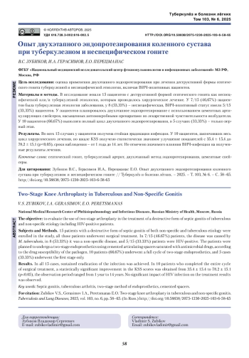 Материалы и методы. В исследование вошли 15 пациентов с деструктивной формой септического гонита как неспецифической или/и туберкулезной этиологии, которым проводилось хирургическое лечение. У 7/15 (46,67%) пациентов была туберкулезная этиология заболевания, у 8 (53,33%) – неспецифическая, ВИЧ-позитивный статус имели 5/15 (33,33%) пациентов. У пациентов планировалось двухэтапное эндопротезирование с использованием цементных артикулирующих спейсеров, насыщенных антимикробными препаратами по лекарственной чувствительности возбудителя. У 10 пациентов (66,67%) выполнен полный цикл двухэтапного эндопротезирования, в 5 случаях (33,33%) – только первый этап.