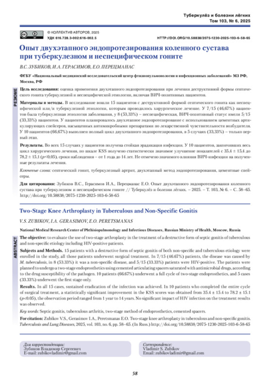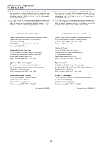 1. Зубиков В.С., Перецманас Е.О., Герасимов И.А. Опыт хирургического лечения туберкулезного и неспецифического артрита методом двухэтапной артропластики с использованием артикулирующих цементных спейсеров, насыщенных антибиотиками // Туберкулез и болезни легких. - 2019. - Т. 97, № 11. - С. 25-33. EDN: QECASN