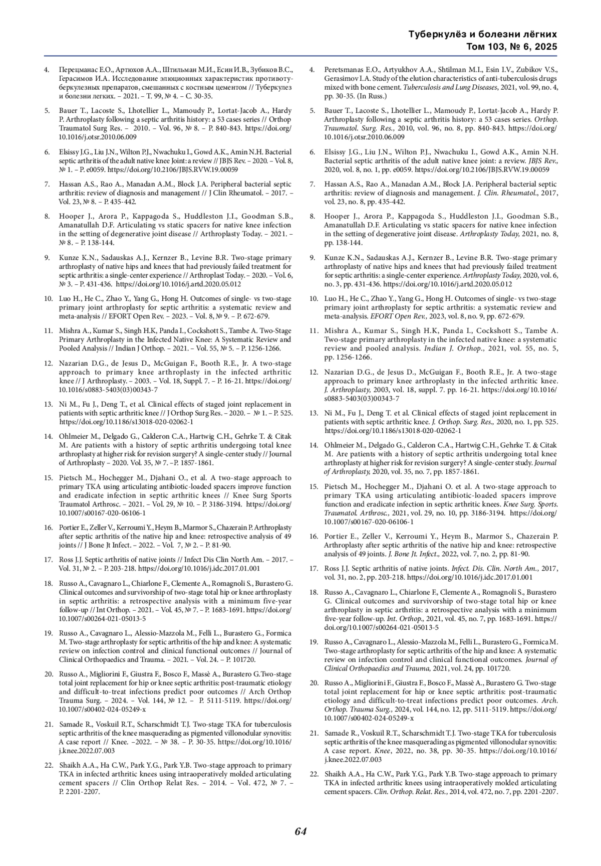 19. Russo A., Cavagnaro L., Alessio-Mazzola M., Felli L., Burastero G., Formica M. Two-stage arthroplasty for septic arthritis of the hip and knee: A systematic review on infection control and clinical functional outcomes // Journal of Clinical Orthopaedics and Trauma. - 2021. - Vol. 24. - Р. 101720.