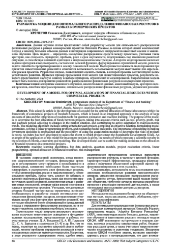 1. Богданов Д.А. Апробация модели оптимального распределения финансовых ресурсов / Д.А. Богданов // Матрица научного познания. 2019. №9. С. 45-49. EDN: BTBPMR