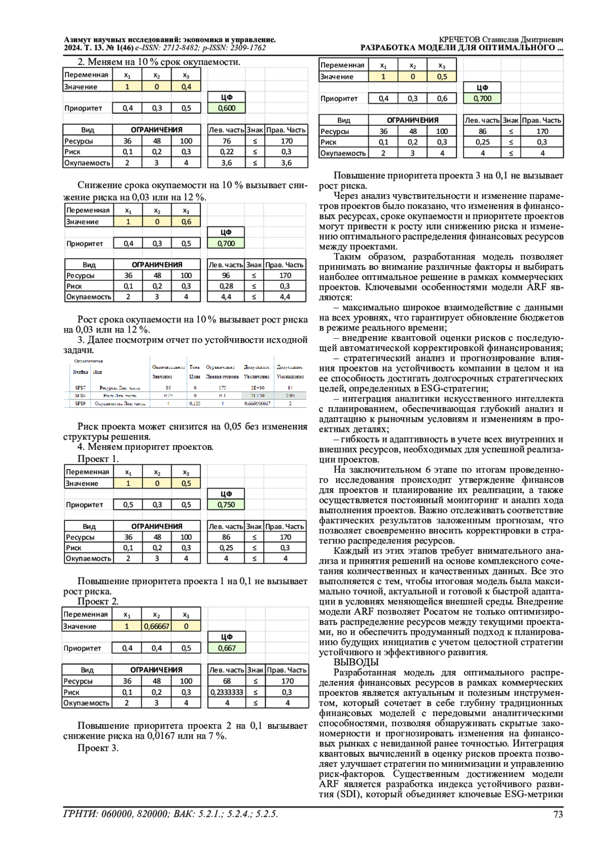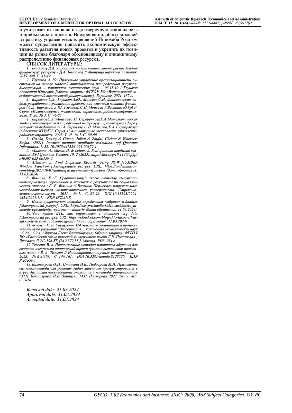 12. Телегин, В. А. Использование методов машинного обучения для создания алгоритма адаптивной оценки времени выполнения проектных задач / В. А. Телегин // Инновационные научные исследования. - 2023. - № 6-3(30). - С. 146-161. DOI: 10.5281/zenodo.8128520 EDN: PXCIGW