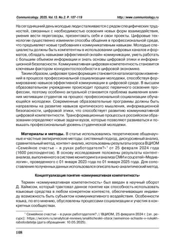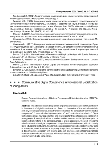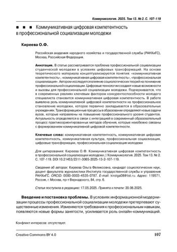 В статье рассматривается проблема профессиональной социализации студенческой молодежи в условиях цифровых трансформаций. На основе теоретического материала концептуализируются понятия: «коммуникативная компетентность», «коммуникативная цифровая компетентность», «профессиональная социализация». Автором исследуется влияние социологических теорий на понимание профессиональной социализации. Цифровые технологии создают новые возможности и вызовы для профессиональной социализации молодежи. Подчеркивается, что в современных реалиях ключевым фактором конкурентоспособности молодого специалиста становится коммуникативная цифровая компетентность. В работе выявлена роль коммуникативной цифровой компетентности на профессиональное становление молодежи, которое первично закладывается в образовательных учреждениях. Трансформационные процессы в образовании определяют новые задачи вузов, которые направлены на повышение профессионального уровня студентов. Актуальность определяется в связи с интеграцией в современный образовательный процесс практикоориентированных методов обучения, которые неизбежно связаны с формированием коммуникативной цифровой компетентности.