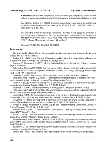 7. Лазинина Е.В. (2022). Коммуникативная компетенция в условиях цифровизации как характеристика субъекта цифрового общества // Современные исследования социальных проблем. №1. С. 64-80.