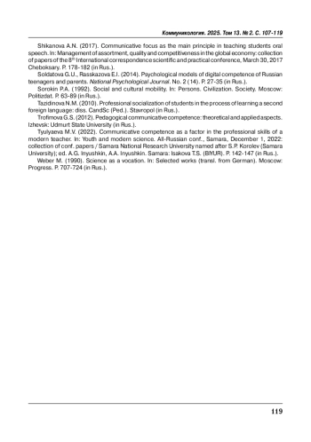11. Савельева Н.Х., Попонина О.В., Гришина Е.В. и др. (2024). Цифровая коммуникативная компетенция как одна из характеристик востребованного специалиста современной России // Гуманитарные науки. №1 (65). С. 69-75.