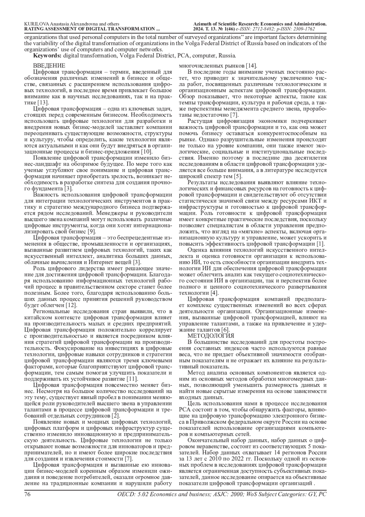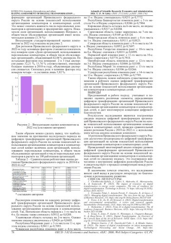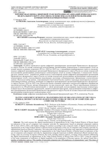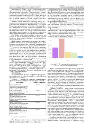Основная цель данной статьи - разработать новый подход к многомерной оценке цифровой трансформации организаций Приволжского федерального округа России на основе показателей использования организациями компьютеров и компьютерных сетей с использованием максимально доступных субнациональных официальных статистических данных. Используя набор данных, охватывающий 14 регионов России, в работе тщательно анализируются аспекты, охватывая различные элементы, влияющие на цифровую трансформацию организаций Приволжского федерального округа России с 2010 по 2022 года. Используя анализ основных компонент показателей цифрового неравенства населения регионов России, авторы обнаружили, что ряд показателей таких как ««Число персональных компьютеров в расчете на 100 работников организаций» и «Доля организаций, использовавших персональные компьютеры, в общем числе обследованных организаций» являются важными факторами, определяющими изменчивость цифровой трансформации организаций Приволжского федерального округа России на основе показателей использования организациями компьютеров и компьютерных сетей.