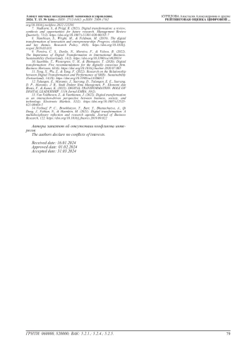 5. Kraus, S., Jones, P., Kailer, N., Weinmann, A., Chaparro-Banegas, N., & Roig-Tierno, N. (2021). Digital Transformation: An Overview of the Current State of the Art of Research. SAGE Open, 11(3). DOI: 10.1177/21582440211047576 EDN: XCNKXJ