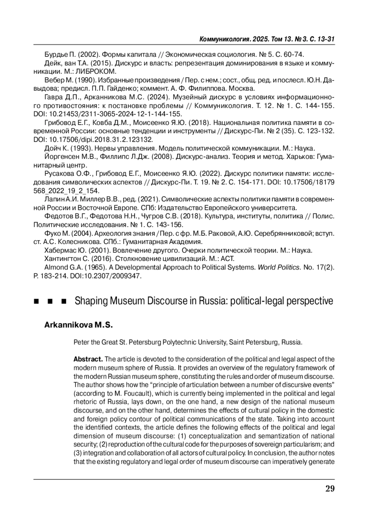 9. Гавра Д.П., Арканникова М.С. (2024). Музейный дискурс в условиях информационного противостояния: к постановке проблемы // Коммуникология. Т. 12. № 1. С. 144-155. https://doi.org/10.21453/2311-3065-2024-12-1-144-155.