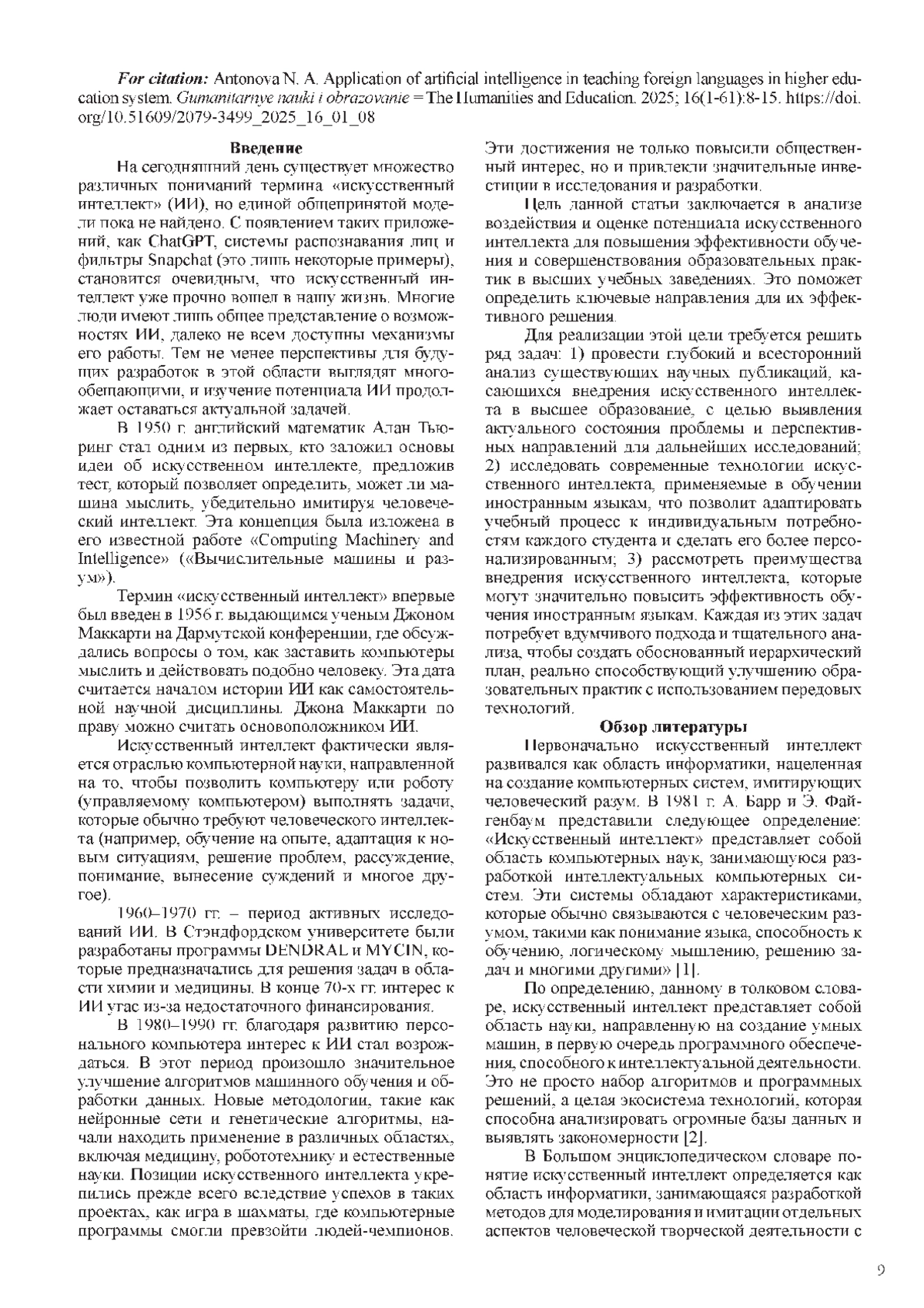 В статье исследуется эволюция концепции «искусственный интеллект» (ИИ) с момента ее возникновения до современного состояния, а также анализируется влияние ИИ на образовательный процесс в высшем образовании, в частности в области преподавания английского языка. Рассматриваются ключевые этапы в истории ИИ, описываются периоды интенсивных исследований, а также подчеркивается комплексность и многогранность определений ИИ. Целью настоящего исследования является анализ воздействия и оценка потенциала ИИ для повышения эффективности обучения и совершенствования образовательных практик в высших учебных заведениях. Автор проводит анализ современных технологий ИИ, включая адаптивные обучающие системы, виртуальных ассистентов и автоматизированные платформы. Основное внимание уделяется преимуществам применения ИИ, в том числе повышению мотивации студентов, улучшению качества обратной связи и расширению доступности образовательных ресурсов. В результате исследования было установлено, что интеграция ИИ в систему высшего образования, особенно в сфере изучения иностранных языков, открывает новые перспективы для индивидуализированного обучения. Подчеркивается важность адаптации образовательных учреждений к происходящим изменениям путем использования потенциала ИИ для создания более эффективной и инклюзивной образовательной среды.