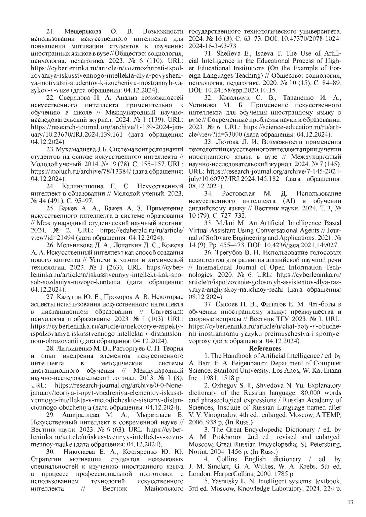 21. Мещерякова О. В. Возможности использования искусственного интеллекта для повышения мотивации студентов к изучению иностранных языков в вузе // Общество: социология, психология, педагогика. 2023. № 6 (110). URL: https://cyberleninka.ru/article/n/vozmozhnosti-ispolzovaniya-iskusstvennogo-intellekta-dlya-povysheniya-motivatsii-studentov-k-izucheniyu-inostrannyh-yazykov-v-vuze (дата обращения: 04.12.2024). EDN: SFYSIT