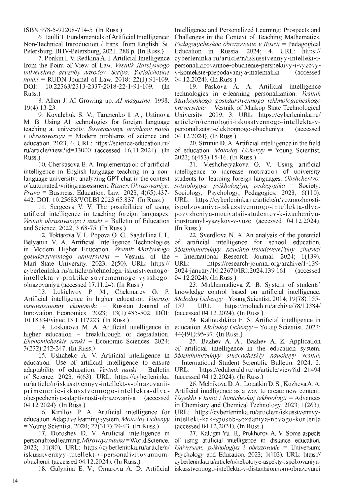 18. Гулынина Е. В., Омарова А. Д. Искусственный интеллект и персонализированное обучение: перспективы и вызовы в контексте преподавания математики // Педагогическое образование в России. 2024. № 4. URL: https://cyberleninka.ru/article/n/iskusstvennyy-intellekt-i-personalizirovannoe-obuchenie-perspektivy-i-vyzovy-v-kontekste-prepodavaniya-matematiki (дата обращения: 04.12.2024). EDN: FROTII