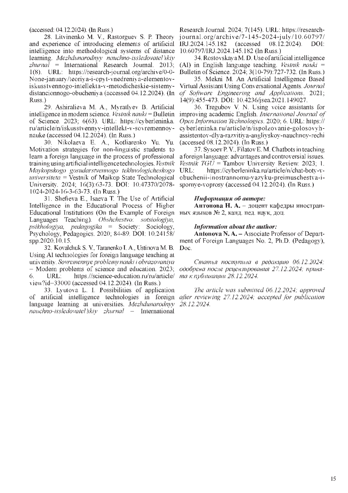 34. Ростовская М. Д. Использование искусственного интеллекта (AI) в обучении английскому языку // Вестник науки. 2024. Т. 3, № 10(79). С. 727-732. EDN: HPRNHV