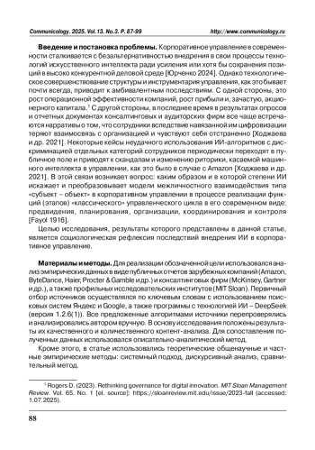 В статье рассматривается проблема преобразования коммуникативных взаимодействий внутри организаций под воздействием имплементации технологий искусственного интеллекта в управленческий цикл. В силу неотвратимости интеграции ИИ для сохранения конкурентных позиций компании сталкиваются с негативными для внутренней коммуникации последствиями их внедрения, которые не проявлялись ранее в классическом управленческом цикле и потому не осознаны. В ходе работы были изучены эмпирические данные в виде публичных отчетов зарубежных компаний (Amazon, Haier и др.), консалтинговых фирм и профильных исследовательских институтов (McKinsey, Gartner, MIT Sloan и др.) и на их основании выделены некоторые тренды: переход к децентрализированным моделям коммуникации, гибридные форматы взаимодействия, методы геймификации рабочего процесса и применение биометрических технологий для персонализированного взаимодействия. К ключевым сопутствующим рискам автором отнесены алгоритмическая предвзятость к сотрудникам, дегуманизация труда, киберугрозы, культурная фрагментация, конфликты в асинхронной среде, социальная изолированность сотрудников, сокращение рабочих мест, необходимость постоянного совершенствования систем мотивации, контроля и коммуникационных стандартов. Снижение возможных рисков связано с формированием адекватных регуляторных рамок и уточнением корпоративных ценностей, поскольку современное управление приобретает характеристики гибридной дисциплины, ориентированной на синтез технологической эффективности и социальной вовлечённости. В этих условиях от сотрудников различных уровней ожидается не только развитие цифровой грамотности, но и готовность к регулярной переоценке управленческих принципов.