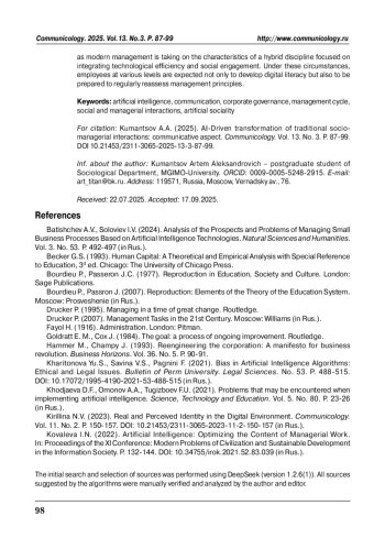 5. Ковалева И.Н. (2022). Искусственный интеллект: оптимизация содержания управленческого труда // Материалы XI Конференции: Современные проблемы цивилизации и устойчивого развития в информационном обществе. C. 132-144. https://doi.org/10.34755/irok.2021.52.83.039.