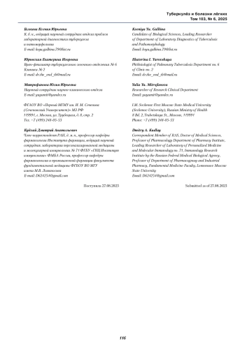 1. Алыменко М.А., Валиев Р.Ш., Валиев Н.Р., Трагира И.Н., Полоников А.В., Балобанова Н.П., Батищев А.В., Коломиец В.М., Маль Г.С., Волкова С.Н., Козлов В.В., Сусликова Е.И., Попова Е.В. Влияние полиморфизма гена МDR1 (ABCB1) на риск развития гепатотоксических реакций у больных туберкулезом легких // Антибиотики и Химиотерапия. - 2023. - Т. 68, № 7-8. - С. 62-69. DOI: 10.37489/0235-2990-2023-68-7-8-62-69