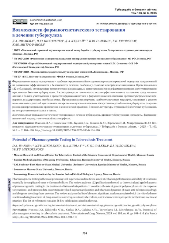 4. Иванова Д.А., Юровская Е.И., Галкина К.Ю. Фармакогенетические маркеры в лечении больных туберкулезом с множественной лекарственной устойчивостью возбудителя // Фармакогенетика и фармакогеномика. - 2025. - № 2. - С. 23-29. DOI: 10.37489/2588-0527-2025-2-23-29