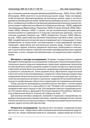 Прогнозы развития тенденций занятости, трудоустройства потенциальной рабочей силы, миграционных потоков представляют в настоящее время особый интерес в свете предпринимаемых государством крупномасштабных инициатив в рамках нового национального проекта «Кадры». В условиях недостаточной полноты статистической информации, связанной с объективными трудностями определения общей численности населения, его половозрастной структуры, количества экономически активного населения, сведений об экономической деятельности хозяйствующих субъектов на территориях воссоединенных регионов имеет научную ценность экспертное мнение специалистов центров занятости населения Ростовской области как интеграционного хаба и воссоединенных территорий Российской Федерации. В статье приводятся результаты экспертного опроса специалистов центров занятости населения Ростовской области, Донецкой и Луганской Народных Республик, Запорожской и Херсонской областей. Авторским коллективом был выполнен контент-анализ ответов экспертов на открытые вопросы, посвященные развитию региональных рынков труда в пятилетней перспективе. Анализ нарративов выявил ключевые ожидания, опасения и тенденции, которые будут определять кадровую и миграционную ситуацию в регионе. Эксперты выделяют два ключевых взаимосвязанных вызова – структурный кадровый голод в жизненно важных производственных отраслях и социальной сферы, а также демографическое давление, выражающееся в старении населения и оттоке перспективной, образованной, квалифицированной молодежи в крупные агломерации.