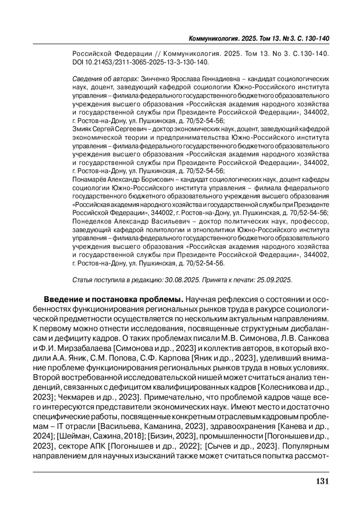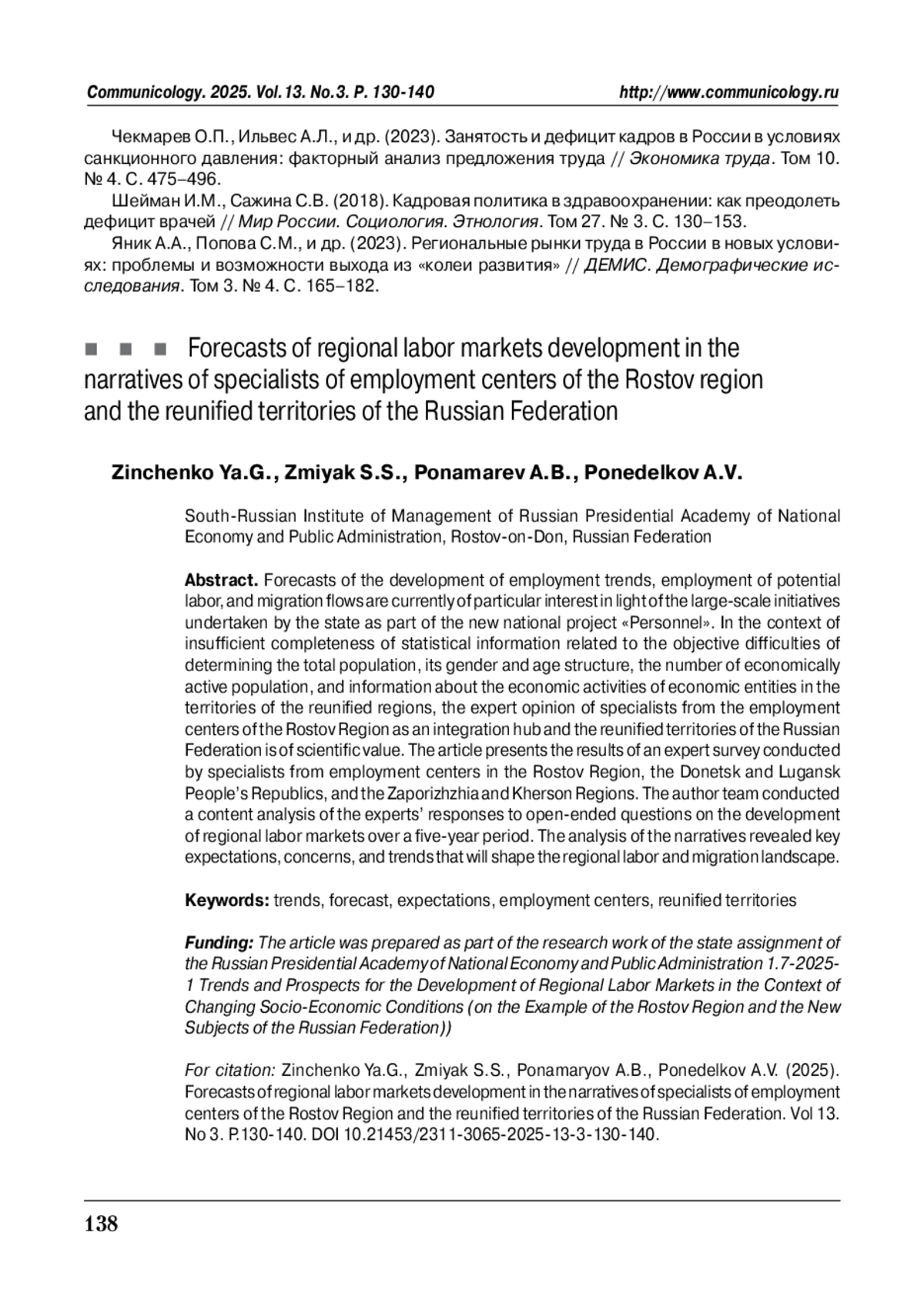 21. Яник А.А., Попова С.М., и др. (2023). Региональные рынки труда в России в новых условиях: проблемы и возможности выхода из «колеи развития» // ДЕМИС. Демографические исследования. Том 3. № 4. С. 165-182.