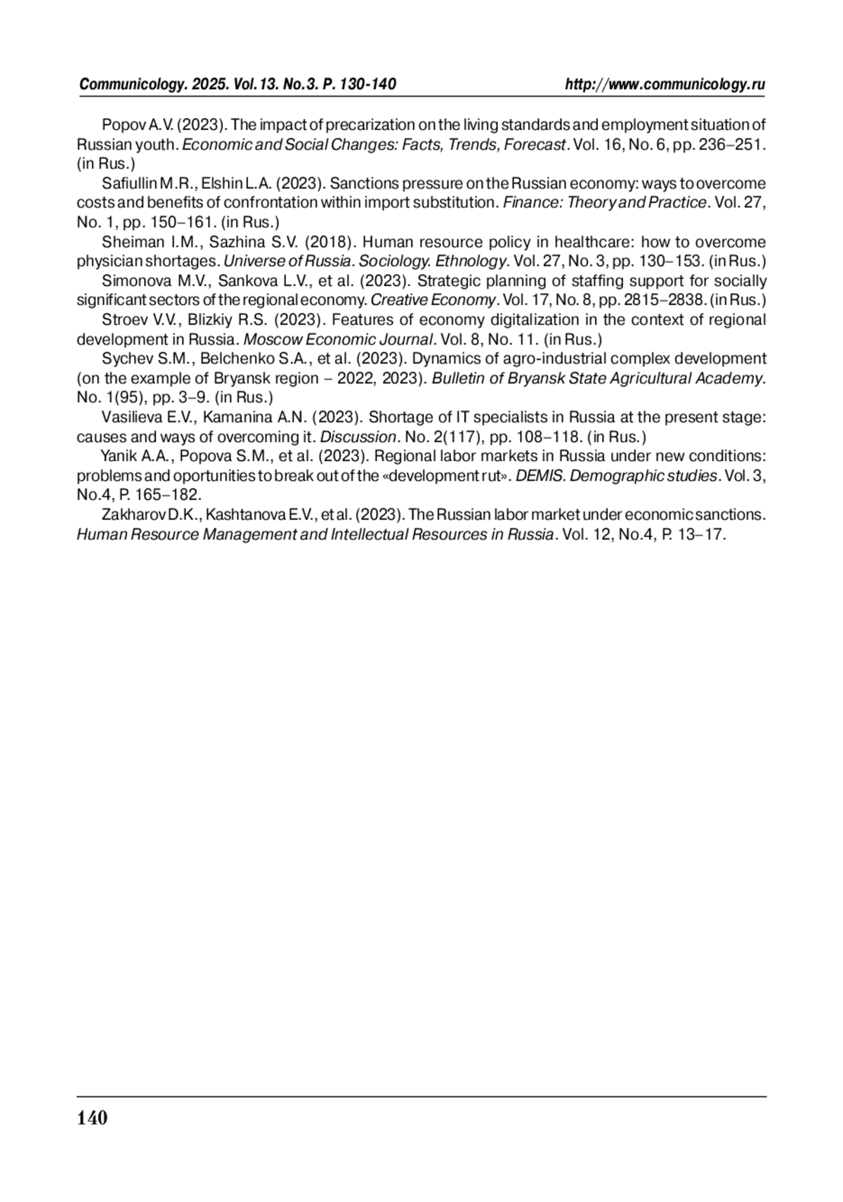 19. Чекмарев О.П., Ильвес А.Л., и др. (2023). Занятость и дефицит кадров в России в условиях санкционного давления: факторный анализ предложения труда // Экономика труда. Том 10. № 4. С. 475-496.