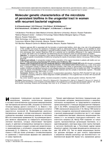 Бактериальный вагиноз (БВ) ассоциирован с формированием полимикробных биопленок, играющих ключевую роль в патогенезе данного состояния и обеспечивающих устойчивость этиологических агентов к антимикробной терапии. Идентификация биопленок возможна благодаря методам прямой визуализации, однако их применение в рутинной практике ограничено. В связи с этим перспективным направлением является применение метода полимеразной цепной реакции в режиме реального времени (ПЦР-РВ) как потенциального инструмента, позволяющего выявить различия в микробном пейзаже влагалища у женщин с биопленочным и небиопленочным БВ и определить наиболее патогномоничных для биопленок представителей микроорганизмов.