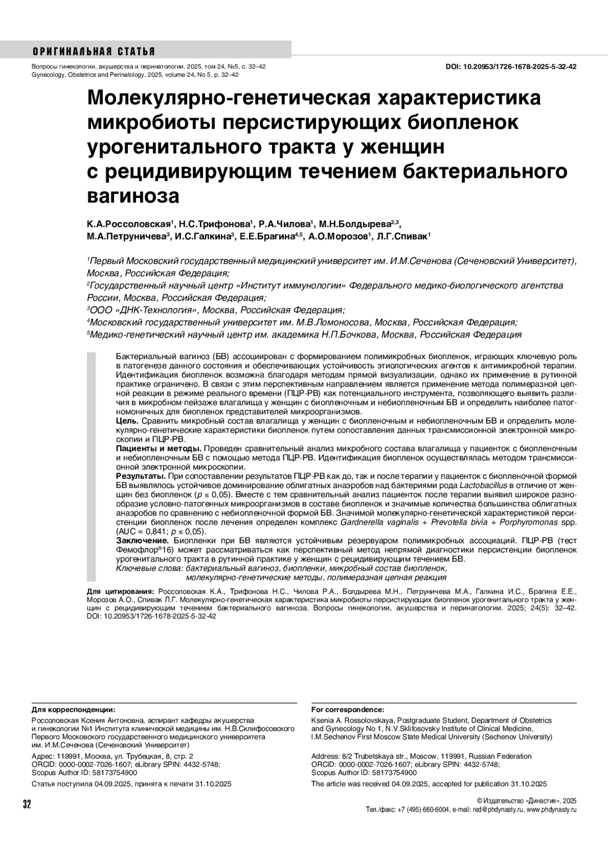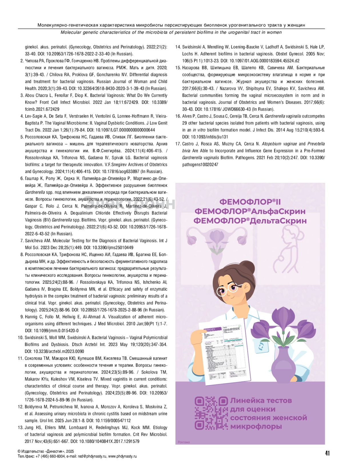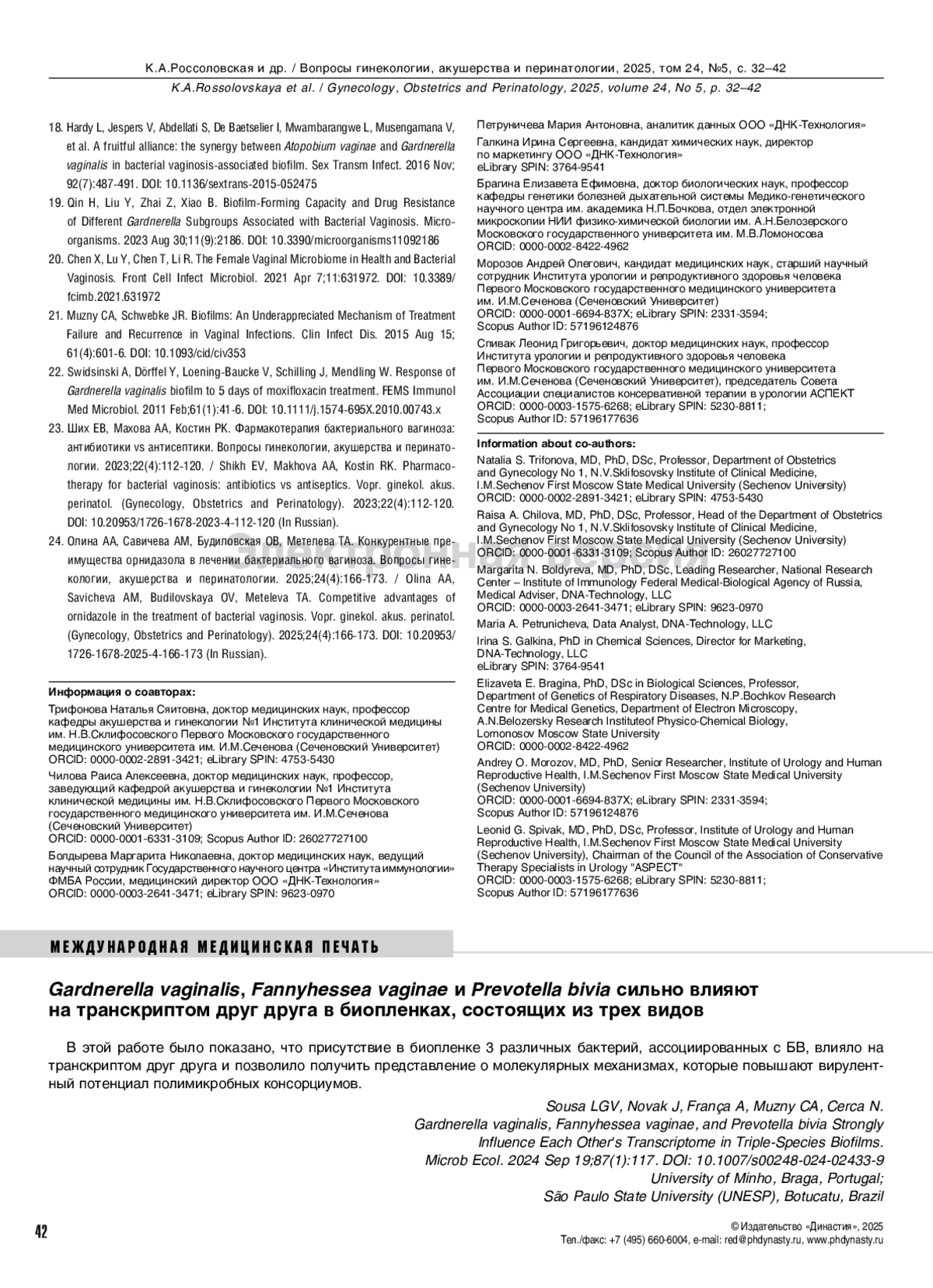 5. Россоловская КА, Трифонова НС, Гадаева ИВ, Спивак ЛГ. Биопленки бактериального вагиноза - мишень для терапевтического новаторства. Архив акушерства и гинекологии им. В.Ф.Снегирёва. 2024;11(4):406-415. DOI: 10.17816/aog633897