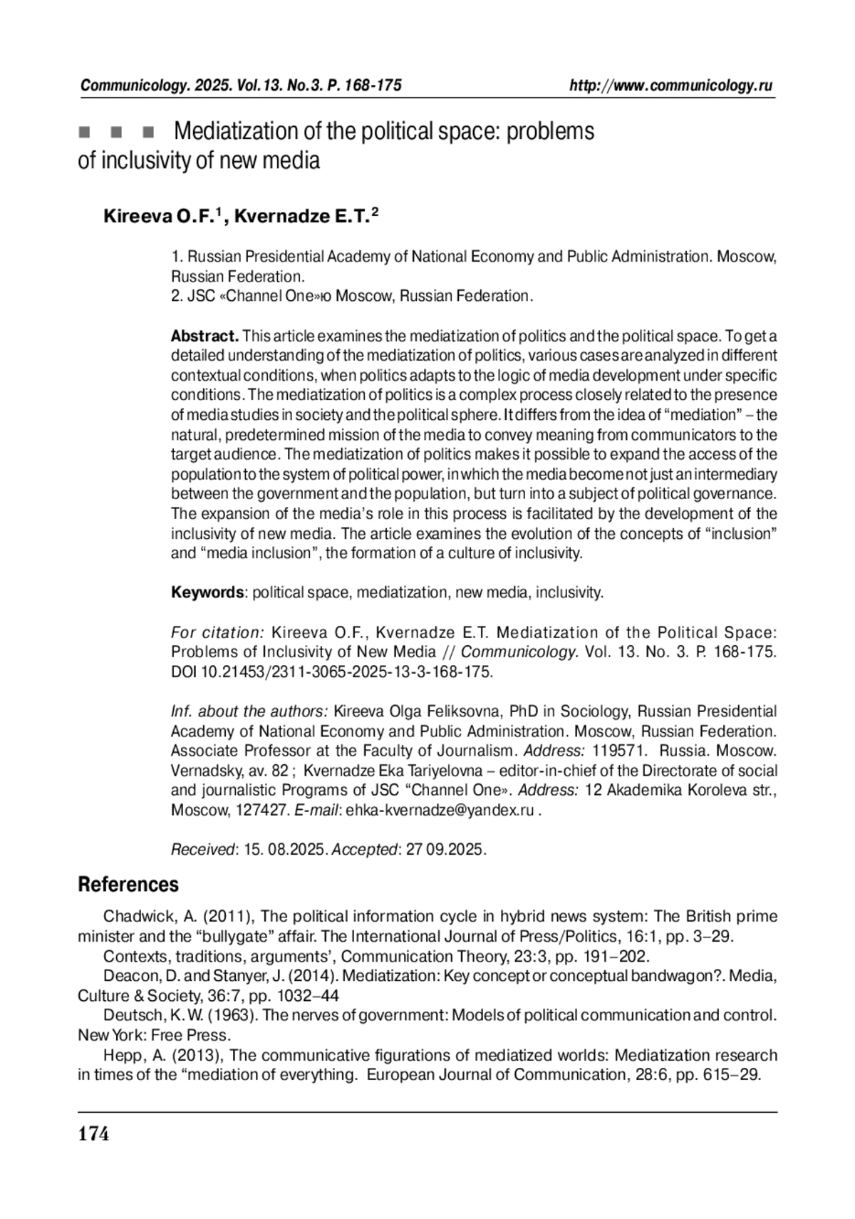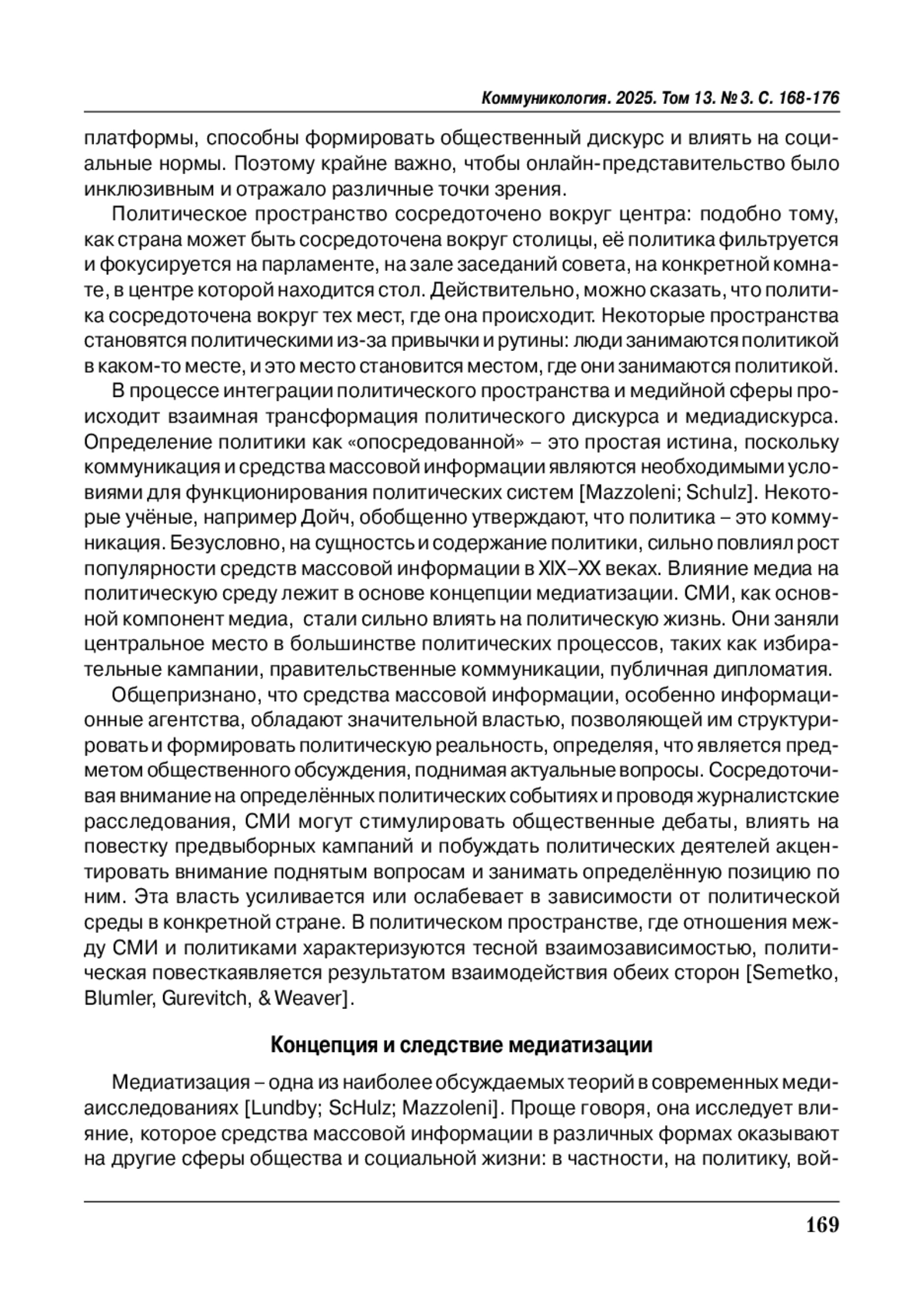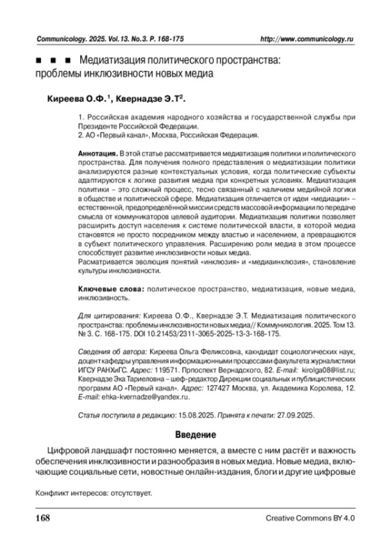 В этой статье рассматривается медиатизация политики и политического пространства. Для получения полного представления о медиатизации политики анализируются разные контекстуальных условия, когда политические субъекты адаптируются к логике развития медиа при конкретных условиях. Медиатизация политики – это сложный процесс, тесно связанный с наличием медийной логики в обществе и политической сфере. Медиатизация отличается от идеи «медиации» – естественной, предопределённой миссии средств массовой информации по передаче смысла от коммуникаторов целевой аудитории. Медиатизация политики позволяет расширить доступ населения к системе политической власти, в которой медиа становятся не просто посредником между властью и населением, а превращаются в субъект политического управления. Расширению роли медиа в этом процессе способствует развитие инклюзивности новых медиа.