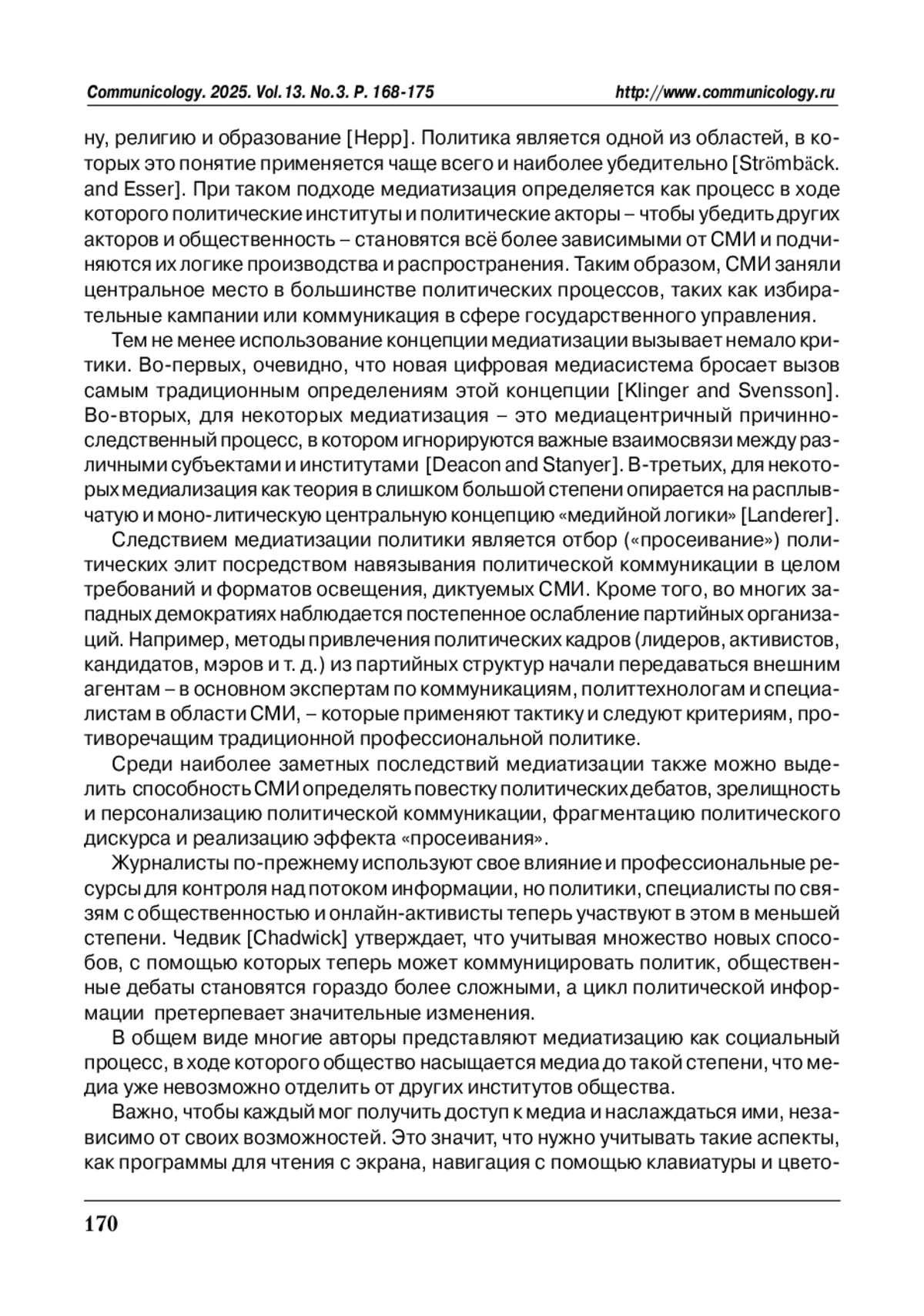 Тем не менее использование концепции медиатизации вызывает немало критики. Во-первых, очевидно, что новая цифровая медиасистема бросает вызов самым традиционным определениям этой концепции [Klinger and Svensson]. Во-вторых, для некоторых медиатизация – это медиацентричный причинно-следственный процесс, в котором игнорируются важные взаимосвязи между различными субъектами и институтами [Deacon and Stanyer].