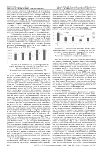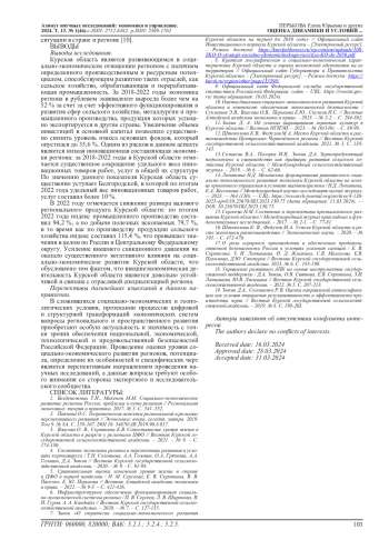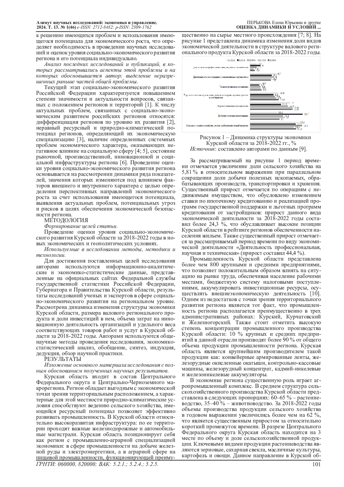 Целью настоящей работы является проведение оценки уровня социально-экономического развития Курской области за 2018-2022 годы в новых экономических и геополитических условиях. В исследовании рассматривается динамика изменения структуры экономики Курской области, размера валового регионального продукта и доли инвестиций в нем, объема затрат на инновационную деятельность организаций и удельного веса соответствующих товаров работ и услуг в Курской области за 2018-2022 годы. Используются общенаучные методы проведения исследования, синтез, дедукция, индукция, анализ, обобщение научной практики, экономико-статистический анализ. Авторами получены следующие результаты: Курская область является динамично развивающимся в социально-экономическом отношении регионом с существенным производственным, ресурсным и иным потенциалом, способствующим развитию таких отраслей как сельское хозяйство, обрабатывающая и перерабатывающая промышленность. В результате исследования авторами были сделаны выводы: за 2018-2022 годы экономика региона выроста более чем на 52% за счет за счет эффективного функционирования и развития сфер сельского хозяйства, металлургии и промышленного производства, продукция которых успешно экспортируется в другие страны. Увеличение объема инвестиций в основной капитал позволило существенно снизить уровень износа основных фондов до 35,6%. Одним из рисков в данном аспекте является наличие низкой инновационной составляющей экономики региона: за 2018-2022 годы в Курской области отмечается существенное сокращение удельного веса инновационных товаров работ, услуг в общей их структуре.